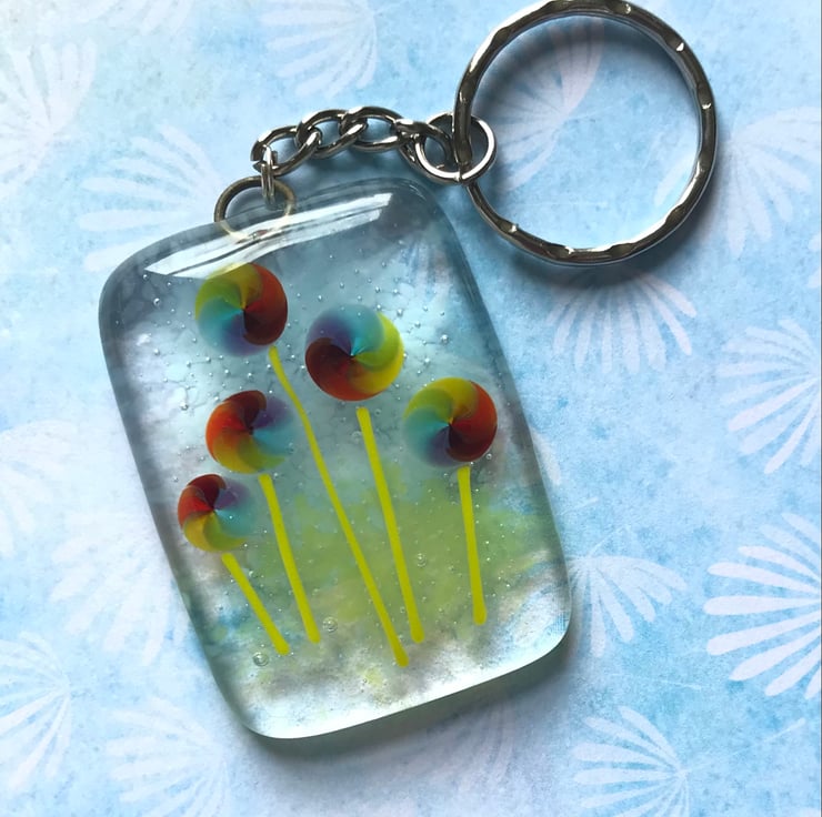 Pretty Keyring with three bright rainbow flowers on a clear glass background. . The glass measures approximately 5cm x 3cm and with the keychain is approximately 10cm in length. Postage is included in the price.