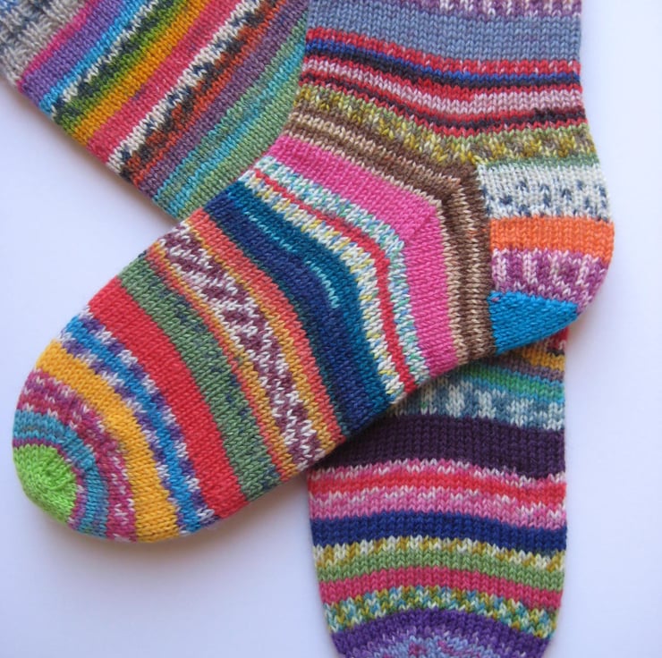 Made from very fine yarn, they are not thick and will fit most footwear. Warm and durable, these socks will keep your feet comfortable and bright throughout the year. A truly unique pair of socks that will cheer up any feet!