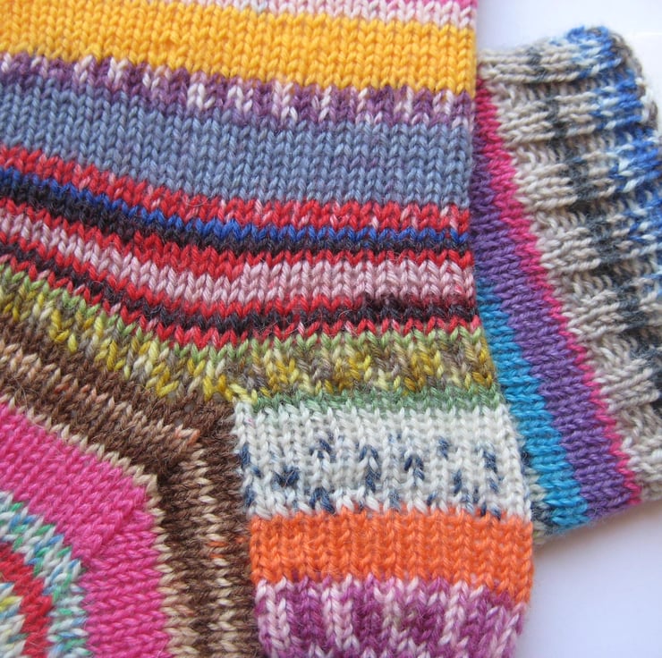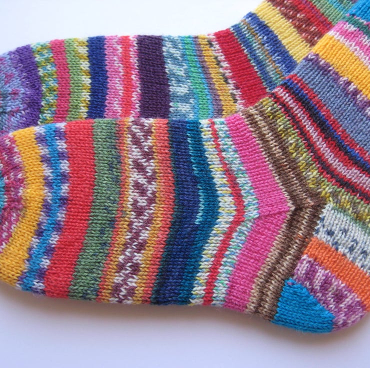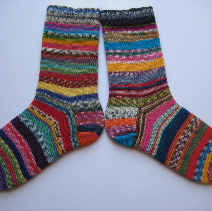 Hand knitted in the round on 5 double pointed needles, these scrappy wool socks are made from many different 4 ply self patterning sock yarns. Made from 75% wool 25% polyamide yarn, in just about every colour you can think of!