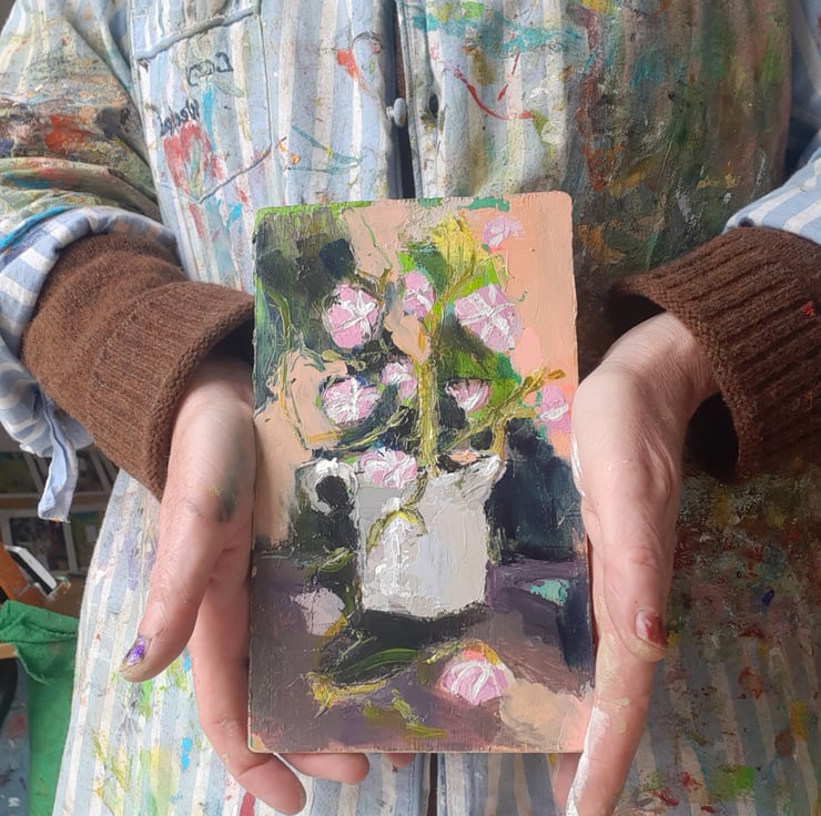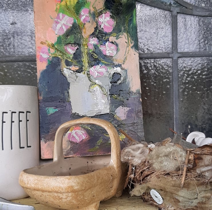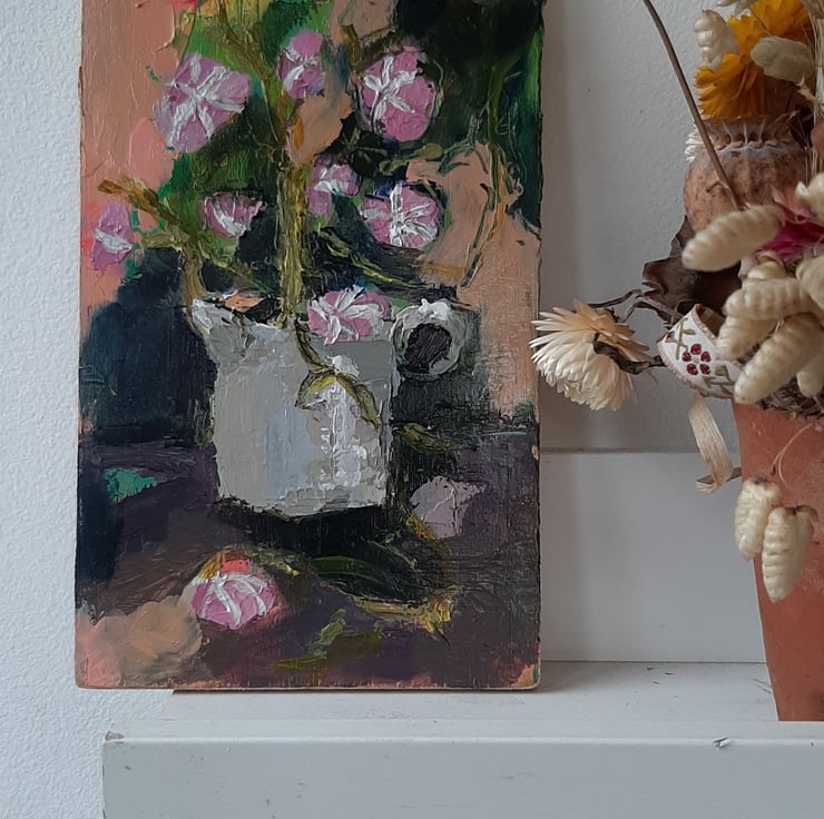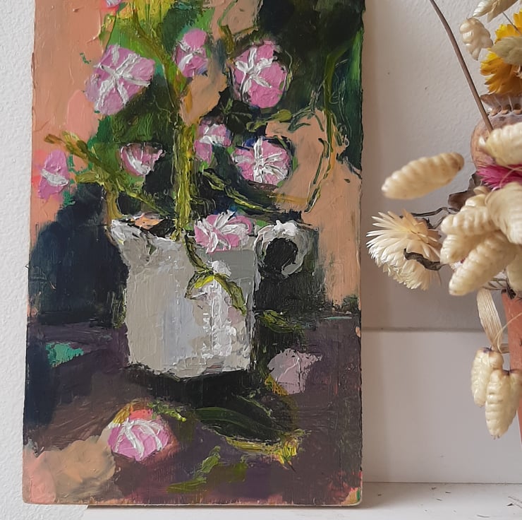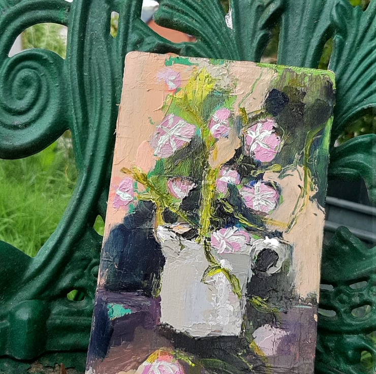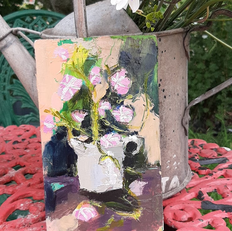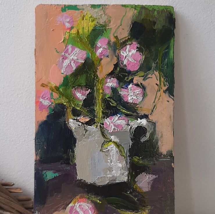 More flowers to celebrate summer. This one is a textured painting of dark greens and pink flowers. I paint on reclaimed wood it has had a light varnish. Measuring 20 cm tall 12 cm wide . I am pleased with the depth and texture of this one. Hope you like it too.