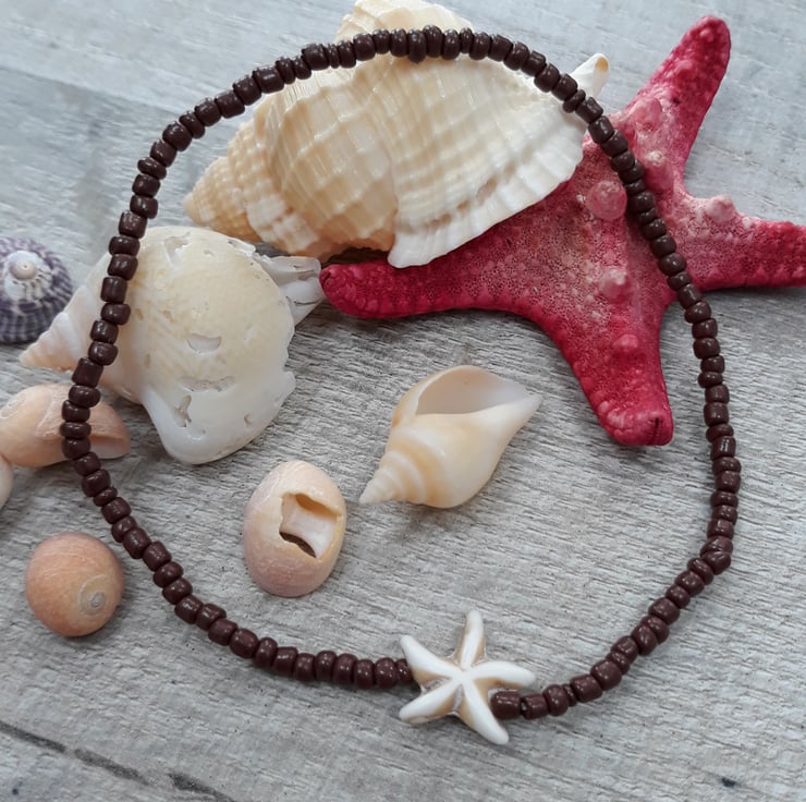Very pretty beaded anklet with random size brown beads approx 2mm diameter with a white turquoise starfish.