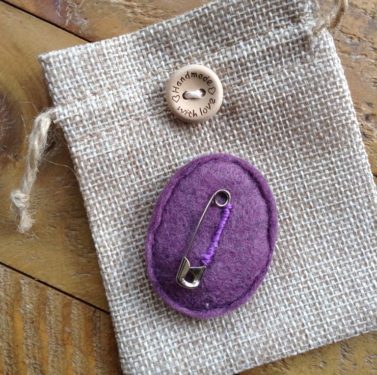 This is machine sewn around a cabochon and backed with felt. A safety pin is attached to fix it to garments.