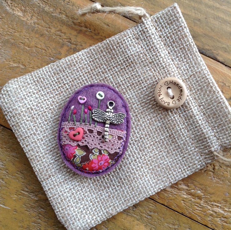 I have embellished some felt with Liberty fabric, crochet lace, an embroidered button meadow and a Tibetan silver dragonfly charm.