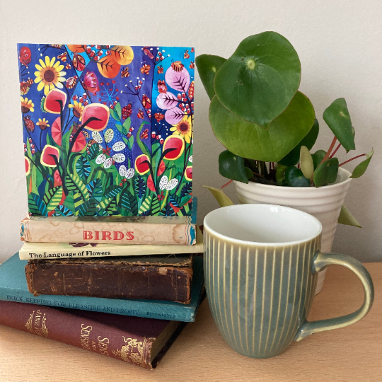 A square card (140mm x 140mm) printed digitally on 330gsm card and hand finished. Supplied with a white envelope and a clear cellophane wrapper. Blank inside for your personal message.
