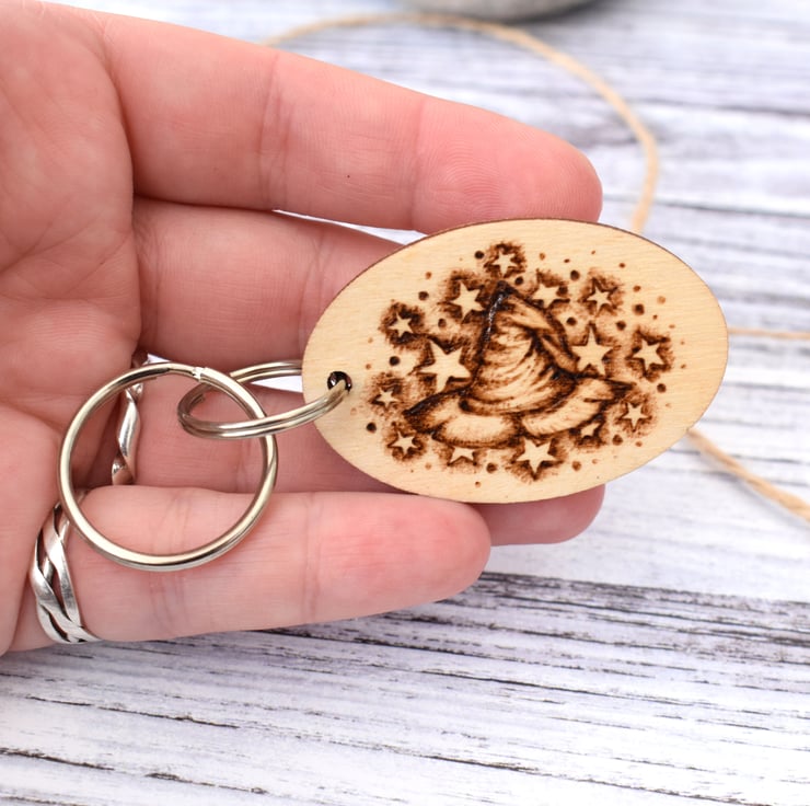 Wizard hat keyring, hand burned using pyrography or wood burning.