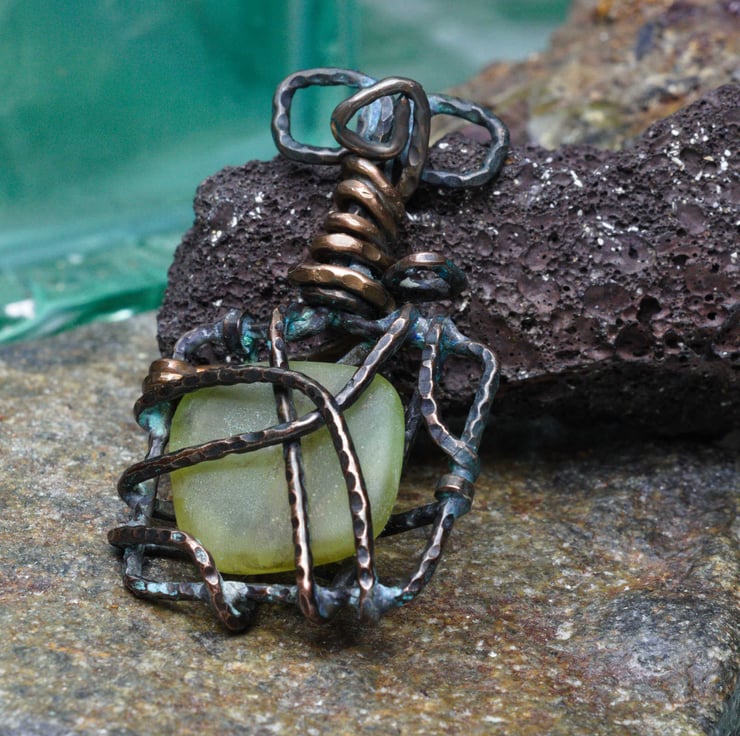 A lovely, interesting sand-tumbled Uranium glass accessory hand wrapped with textured Copper wire that has been aged and weathered giving it a “grunge look”. This process gives the Copper a real patina, it is not an artificial colourant/pigment. The Copper is not varnished and overtime its patina will change, this engaging property of Copper means that your piece will take on individual characteristics, telling its own story of how it has been used.