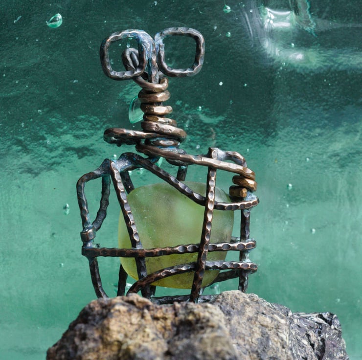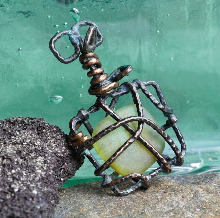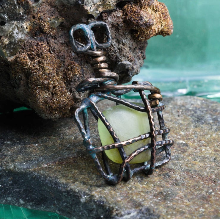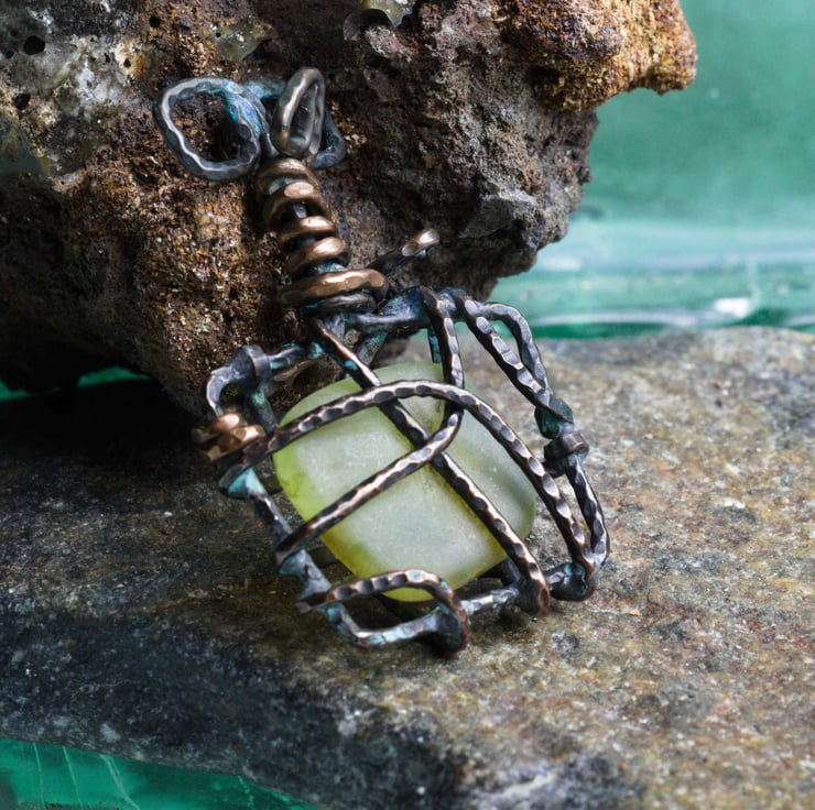 We made this piece from reclaimed antique Uranium glass, it has been kiln-fired then sand-tumbled to create a sea-glass effect before being hand wrapped with textured Copper wire using Silver soldered joints to add strength and aesthetics.