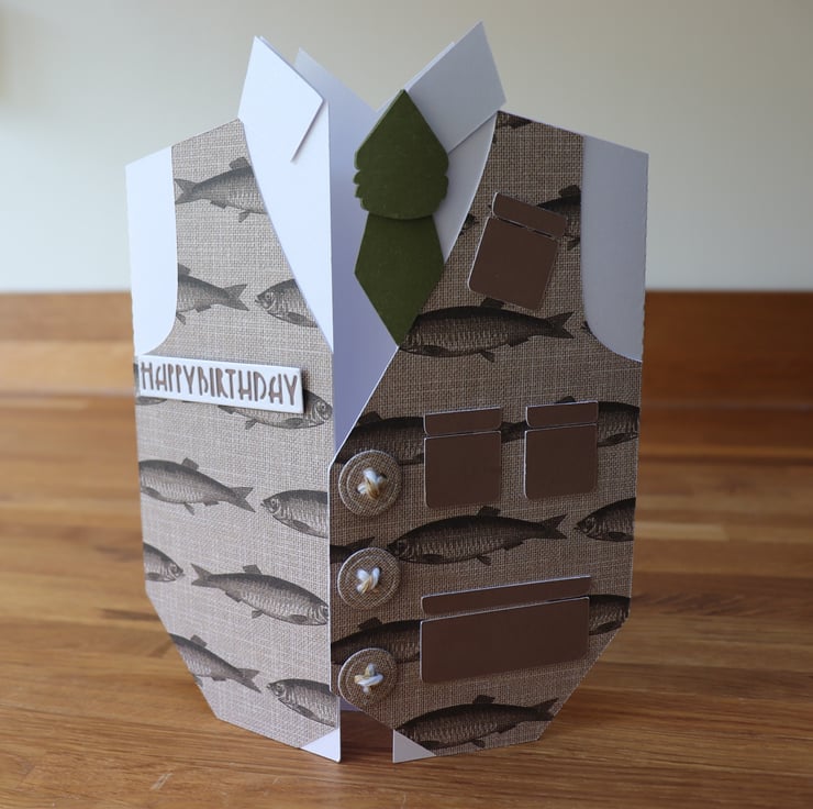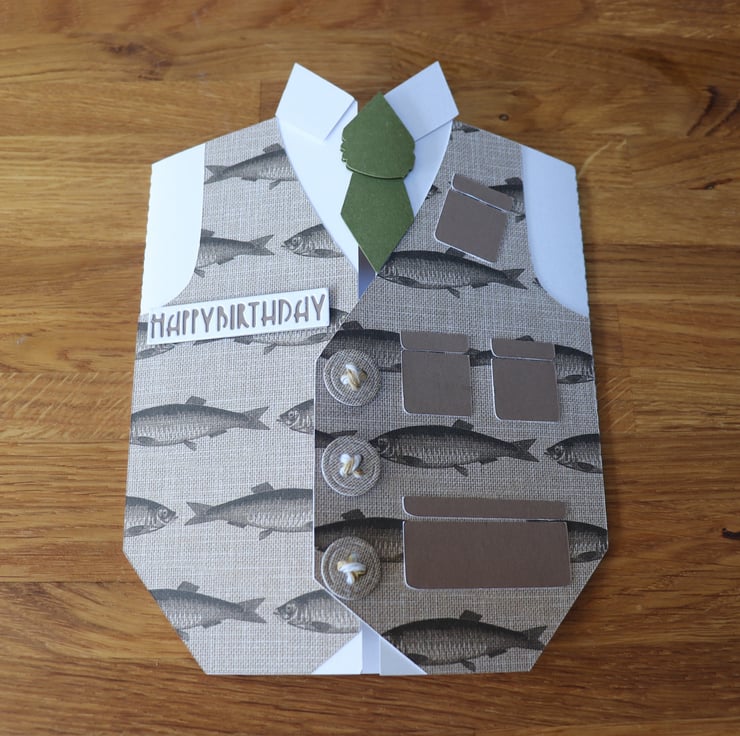 The card base is pearlescent card, the waistcoat/fishing jacket has a fish design, and the tie is cut from faux leather card, the sentiment is Happy Birthday on the outside.