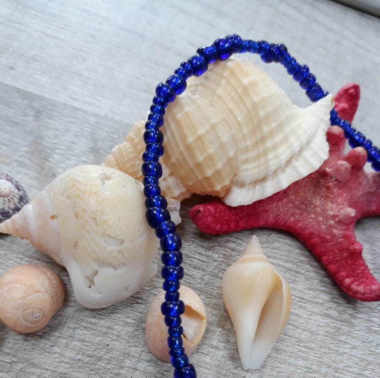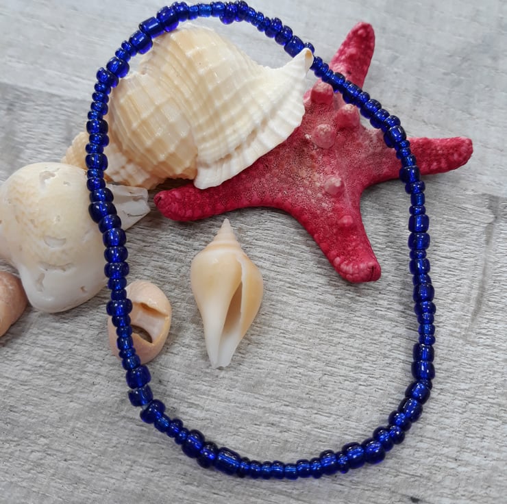 For this lovely bright anklet I have used silver lined blue seed beads, varying in size from 1mm to 4mm thread onto elastic.