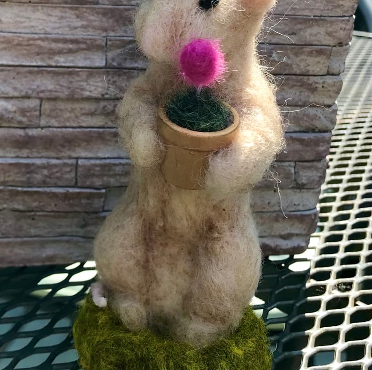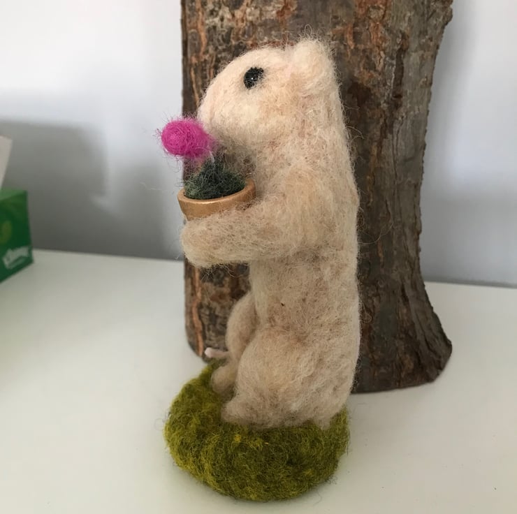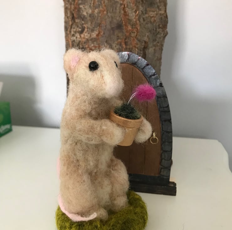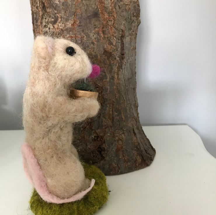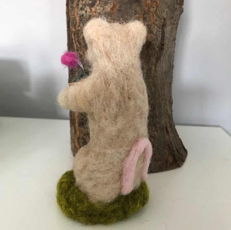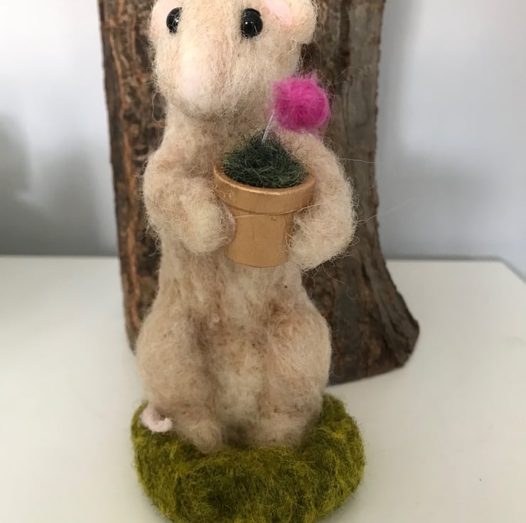 Needle felted mouse with a single flower in a pot.13 cm high . Painted wood pot