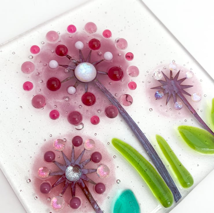 To make it, I started by cutting 2 squares of transparent art glass. I then hand cut allium stalk shapes from copper foil with a scalpel. I then stencilled powdered glass to make the flower heads and added the copper, capping it all with the second square of glass. It then all goes into my glass kiln and is slowly fused overnight. Once completely cooled, I then added coloured and dichroic dots and leaves which I have made previously to give some added interest to the design. A second firing is done overnight the next day to tack fuse the dots onto the design, so that they stand proud of the glass, giving it a 3D effect