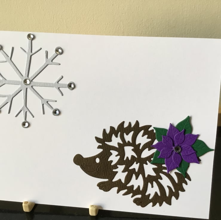 A cute hedgehog Christmas card walking towards a beautiful snowflake which has been topped with beads glistening in the cold.