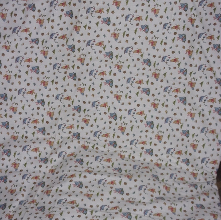 This hand quilted babies quilt or playmat has a design of Winnie The Pooh, Piglet, Tigger and Eeyore on a patchwork style fabric and is backed with a contrasting white fabric with them all on.