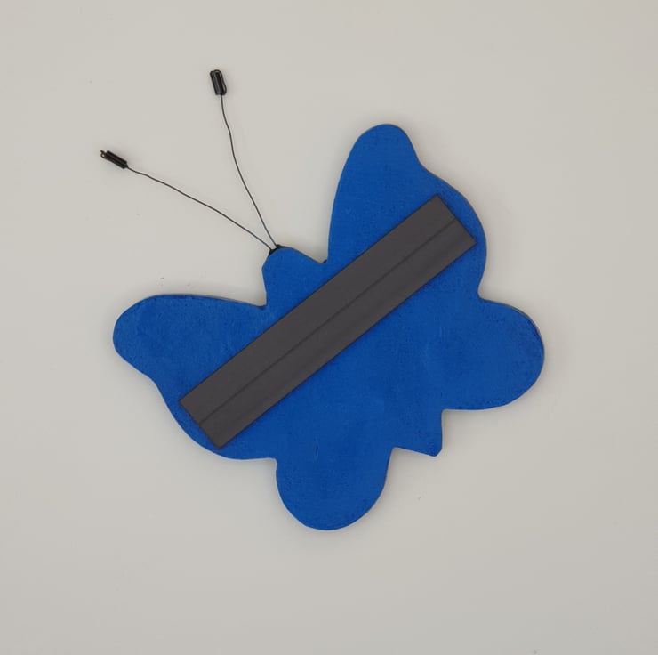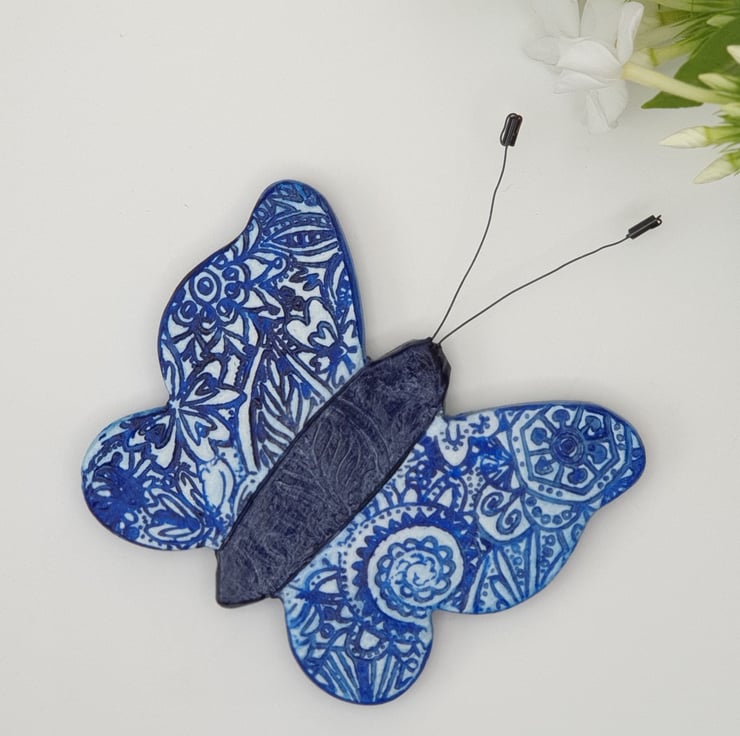 Pretty dark blue and white textured butterfly fridge magnet which has been lovingly made from air dry clay, painted and varnished for protection. The butterfly's antennae have been handmade from jewellery wire and beads. A strip magnet has then been firmly attached to the back .