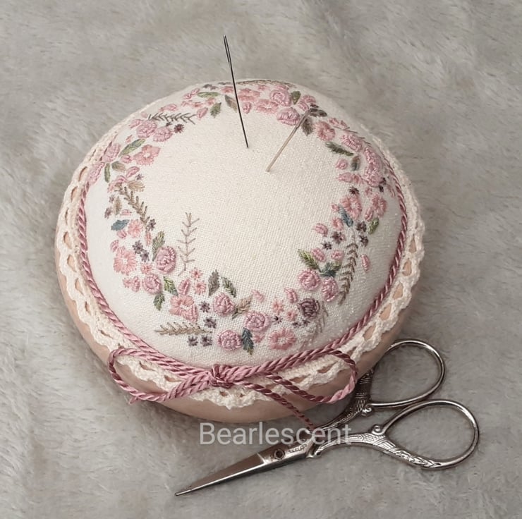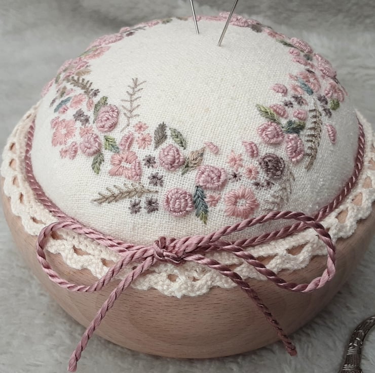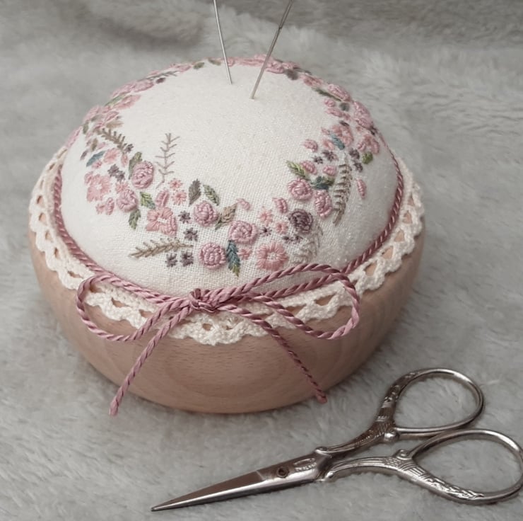 I have used a pink colourway, dull rose, dusky pinks and plum with greens, hand embroidered using various threads and stitches including buillions, satin, fern, fly, straight stitches and French knots. Sewn around the edge of the pincushion top in a floral wreath design.