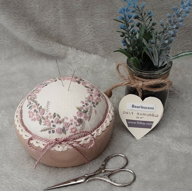 A unique hand embroidered pin cushion created by Bearlescent, a luxury handmade gift.