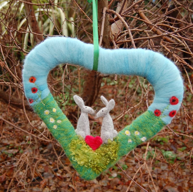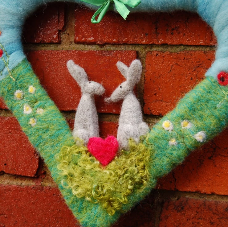 A heart shaped wreath wrapped in wool fibre, decorated with 2 needle felt hares and a scattering of hand embroidered flowers and a felted red heart.