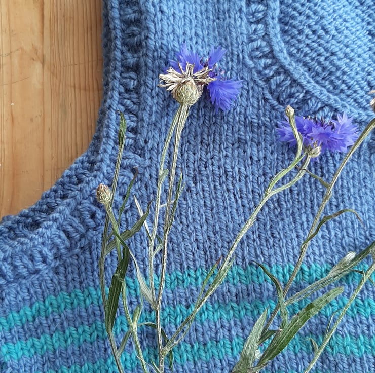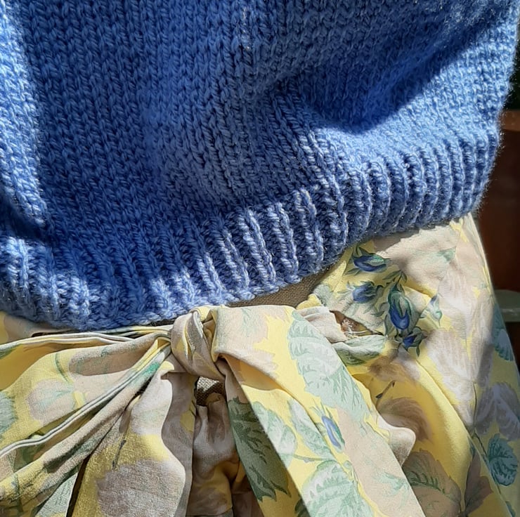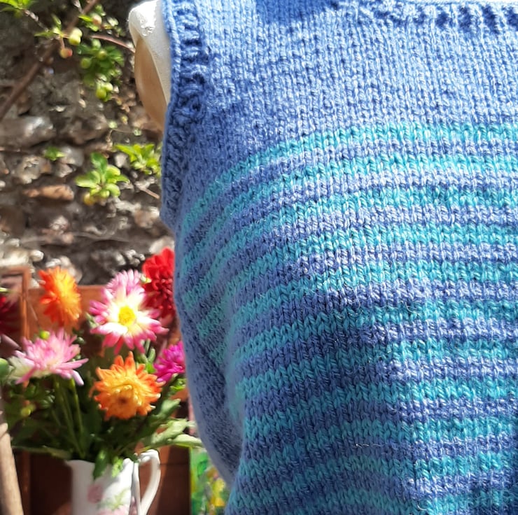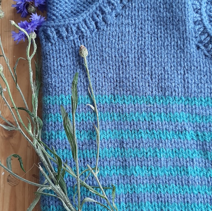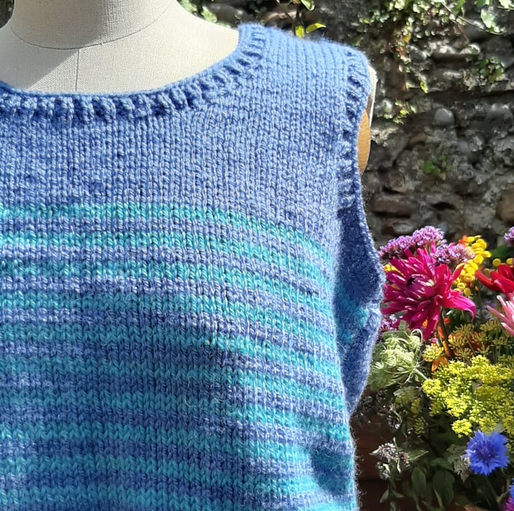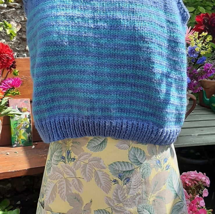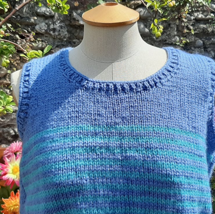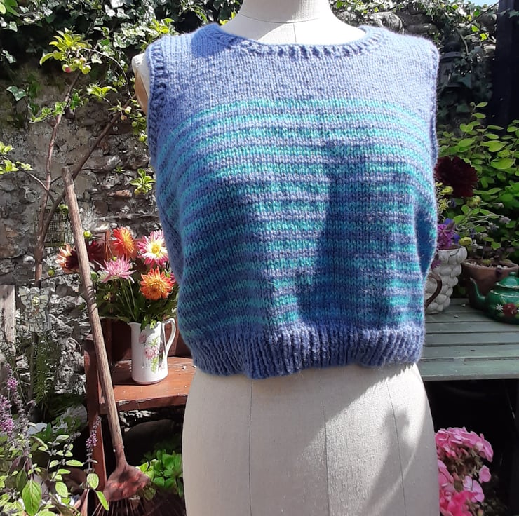 Cute hand knitted tank top. 47 cm across the body and from nape of neck to bottom length is 46 cm .soft and a wool acrylic mix so easy to wash. Neatly knitted and very sweet