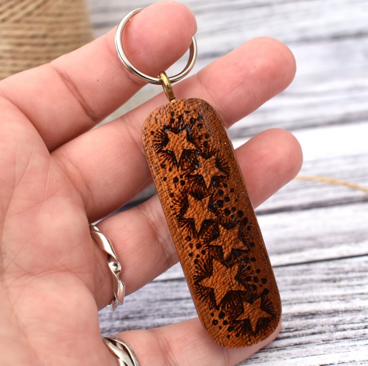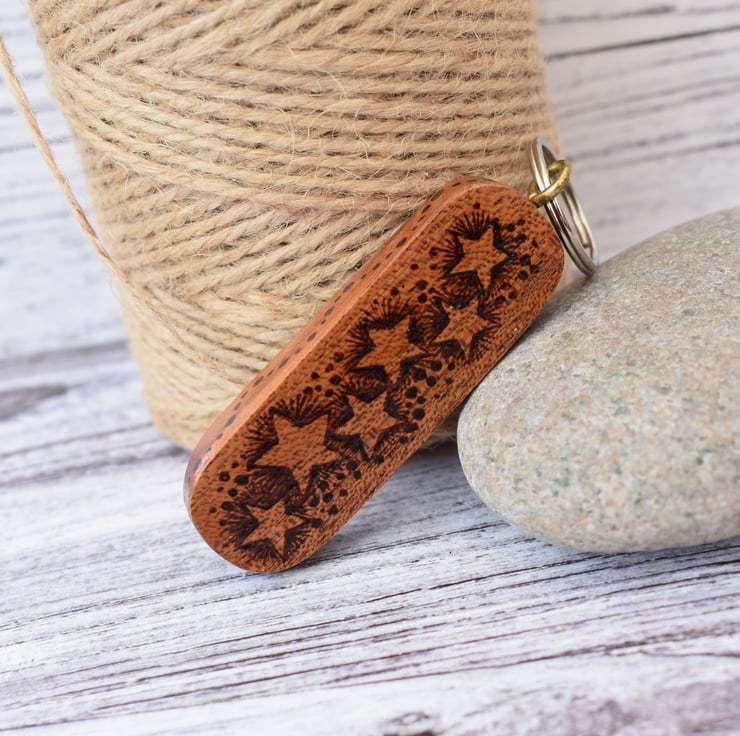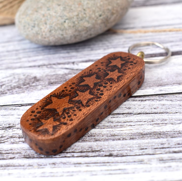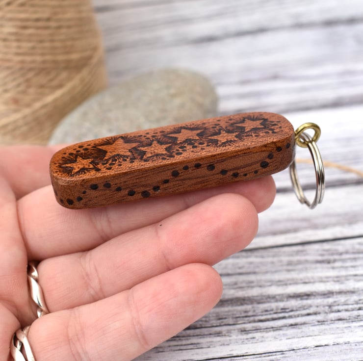 A sapele mahogany wood keyring with smattering of stars to front and back, created by hand using pyrography/