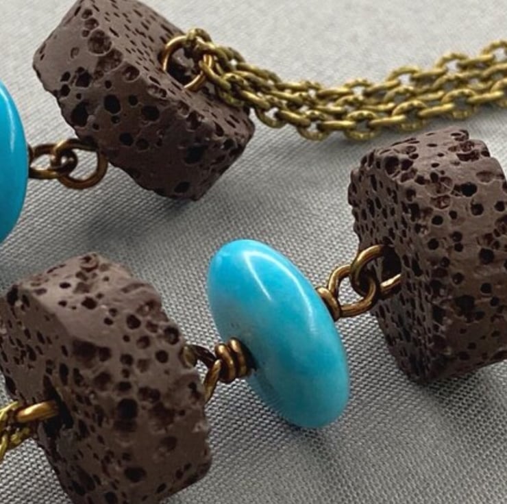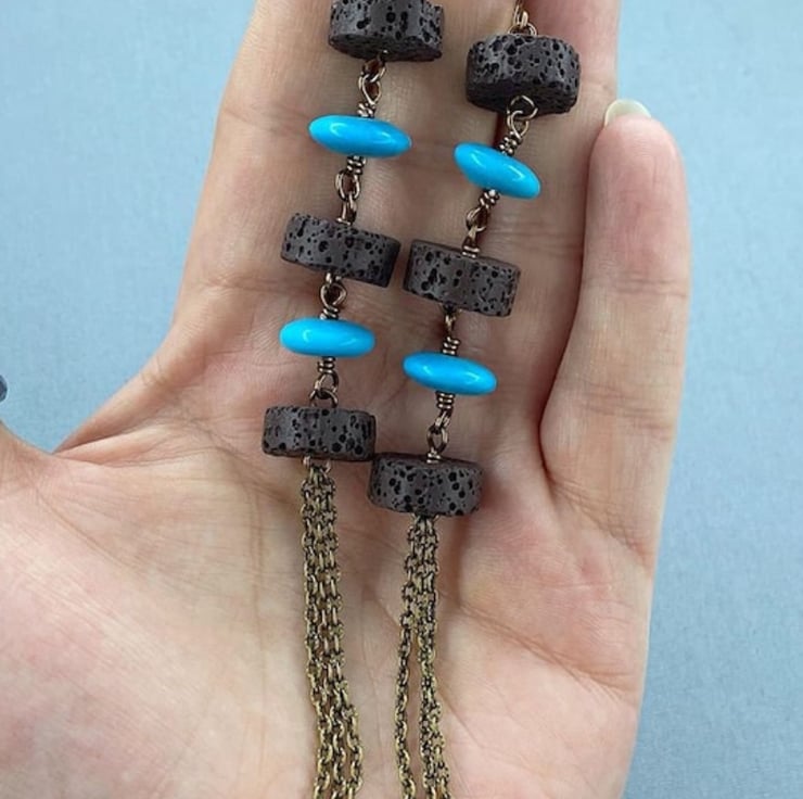 Long Lava Rock Stone & Blue Magnesite Bronze Boho Tassel Earrings