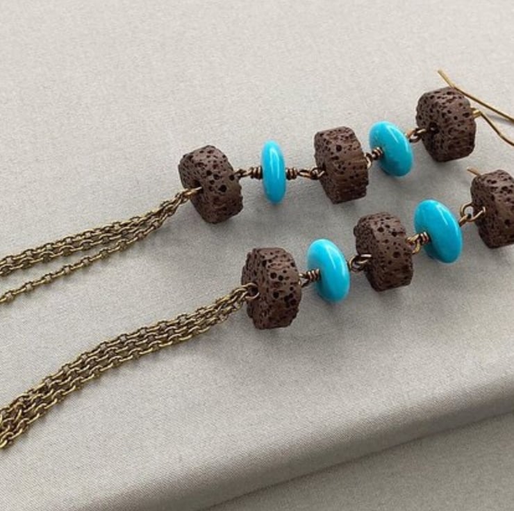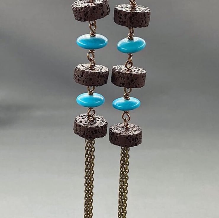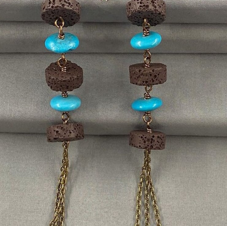 A very rustic boho style of earrings featuring lava rock and magnesite with a chain tassel.