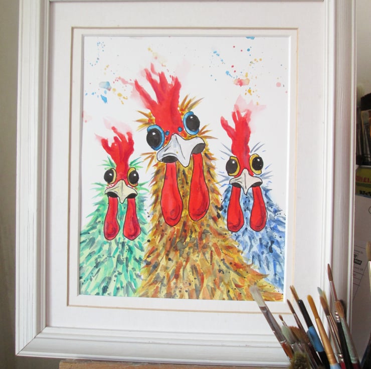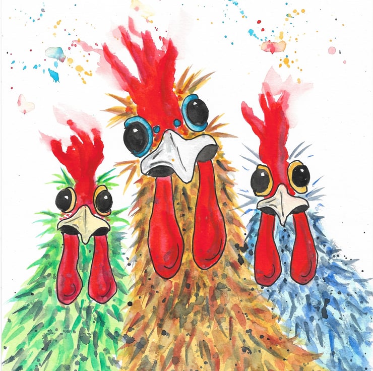 An original watercolour painting on quality paper. Chicken Girls painting by marjansart. Funky Chicken Girls at Hen Party art.