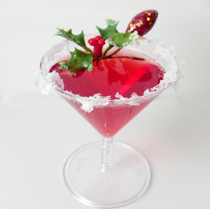 These delightful festive cake toppers consist of a mini martini cocktail plastic glass filled with cranberry resin, topped with fake holly, poinsettia, berries and sparkly leaves and twigs.