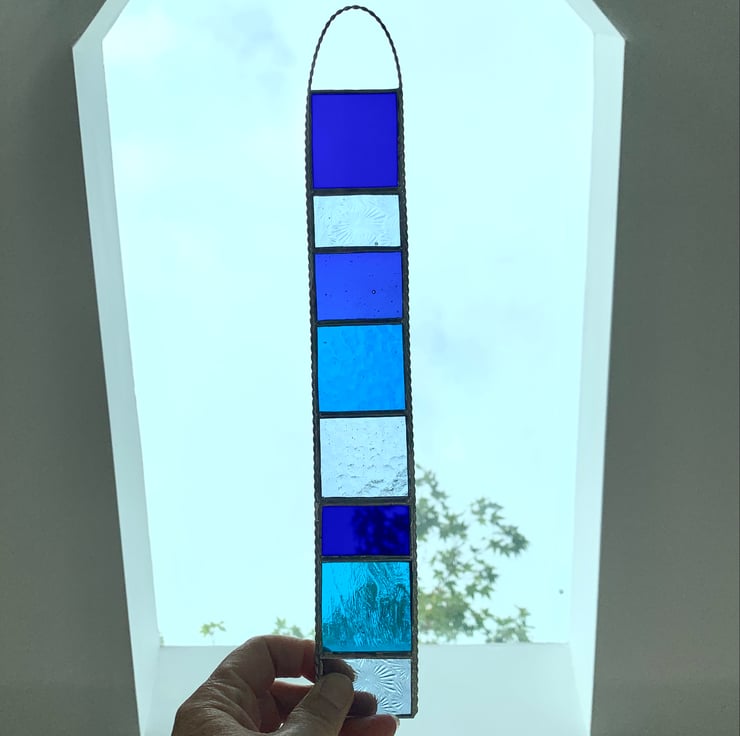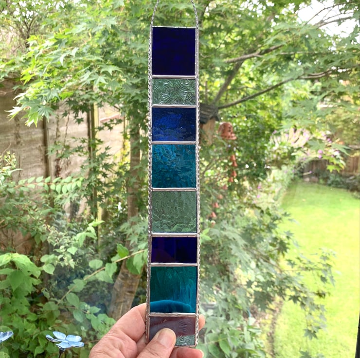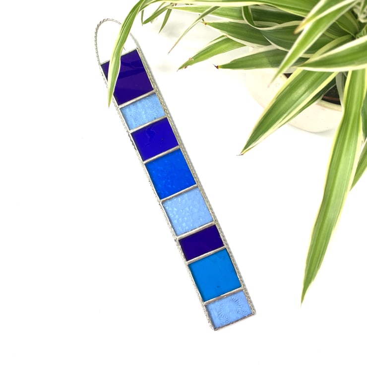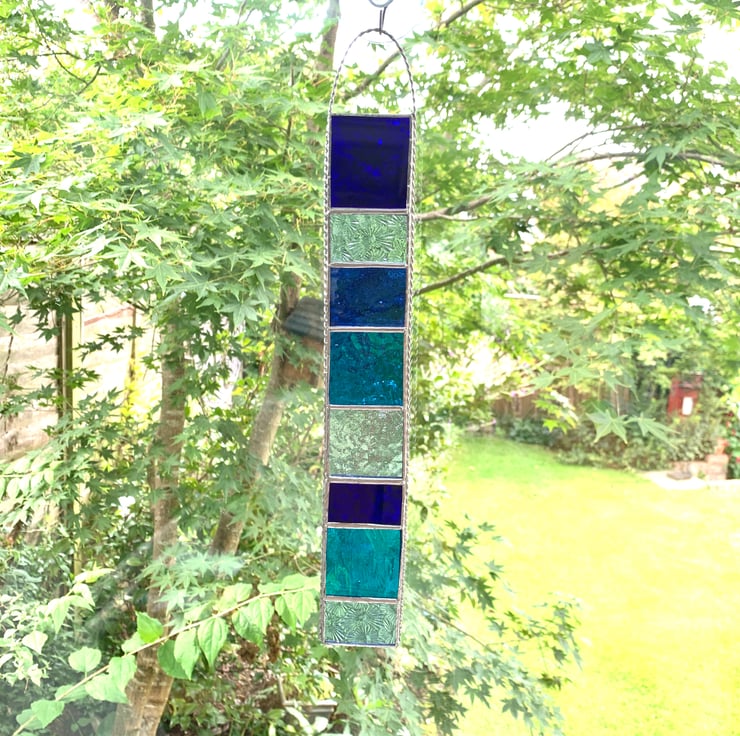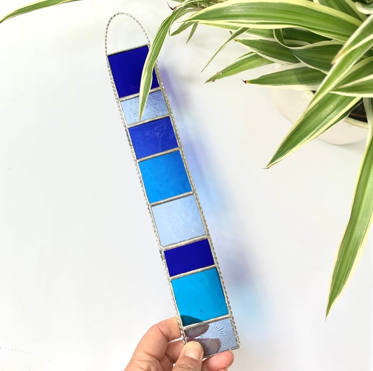 This hanger has been made using different shades of blue and turquoise coloured stained glass.