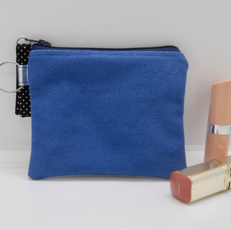 Flat style. The navy blue zip across the top has a tab of black and white dotty fabric. I've added a silver tone split ring into one of the side seams, ready to clip into your bag or add your keys.