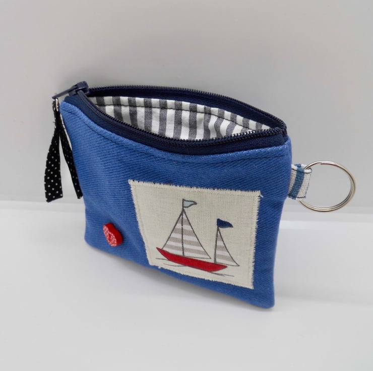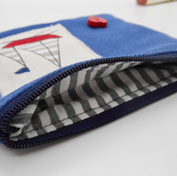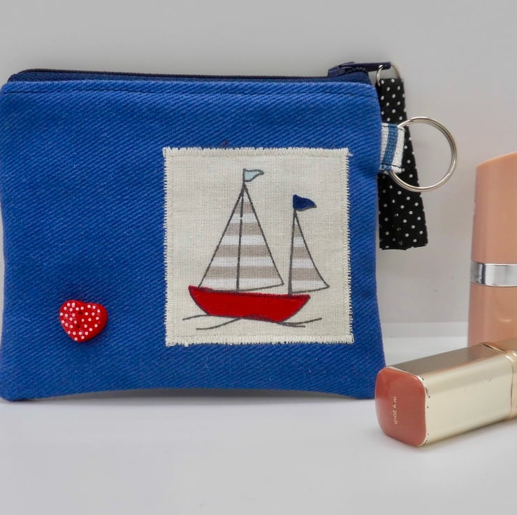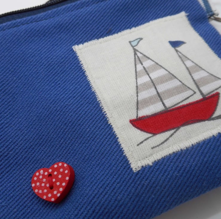 This coin purse/make up bag is made using strong denim and is fully lined with grey and white striped cotton fabric. On the front I have appliquéd a fabric patch depicting a red sailing boat and there's a little red wooden heart button alongside.