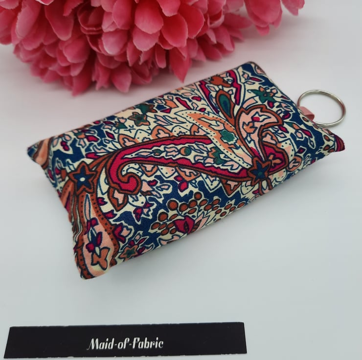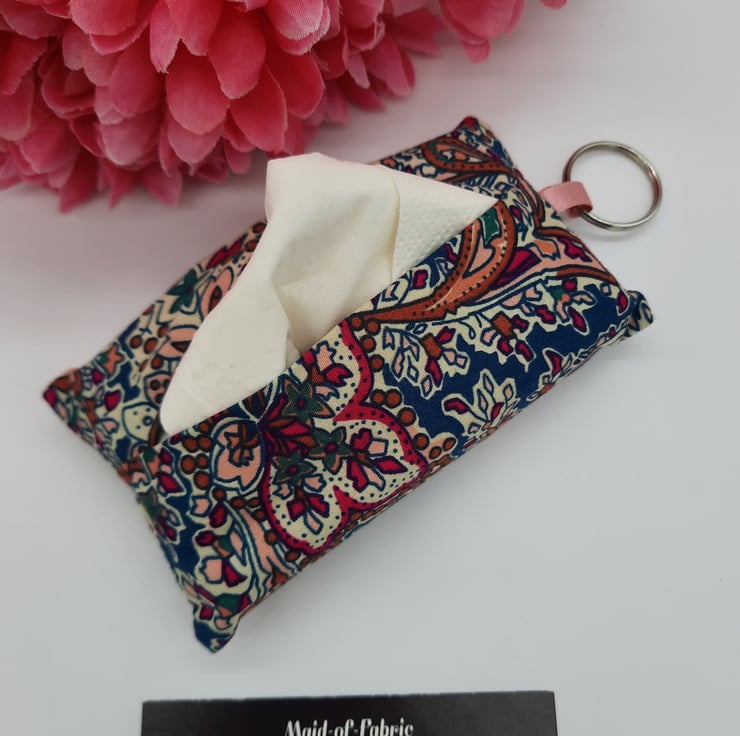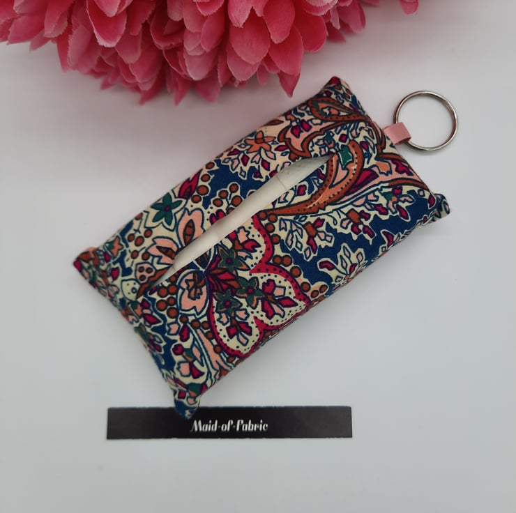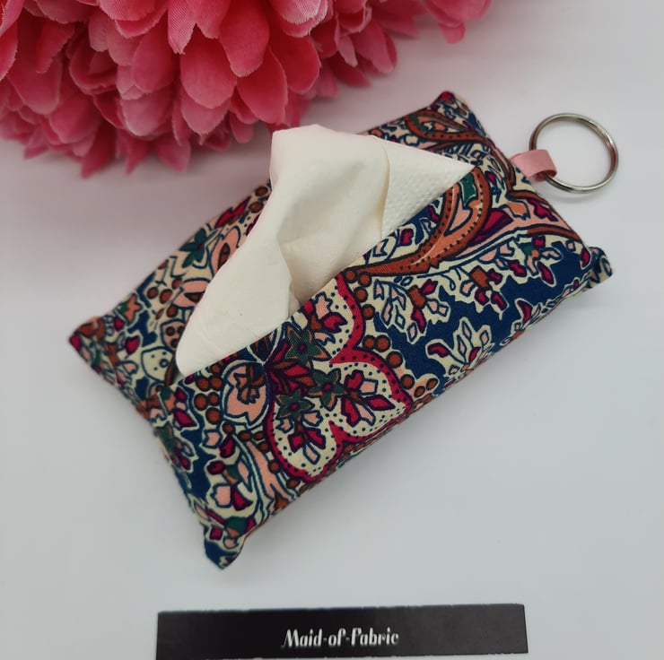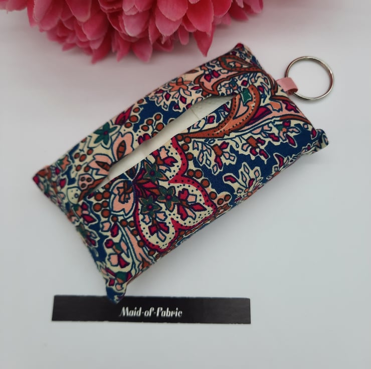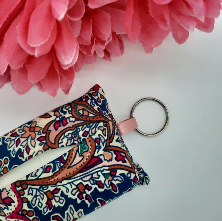 Keyring tissue holder made using a raspberry and teal pattern cotton fabric.