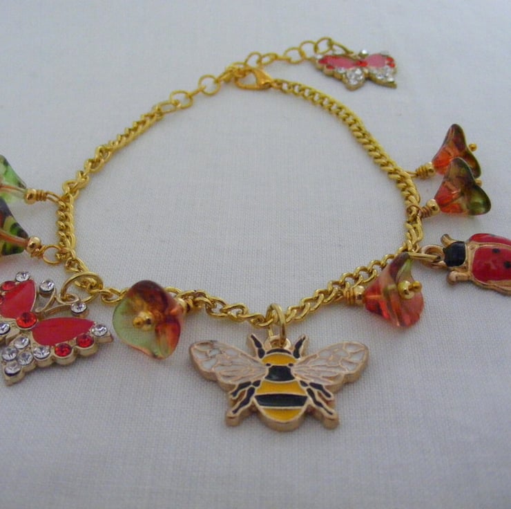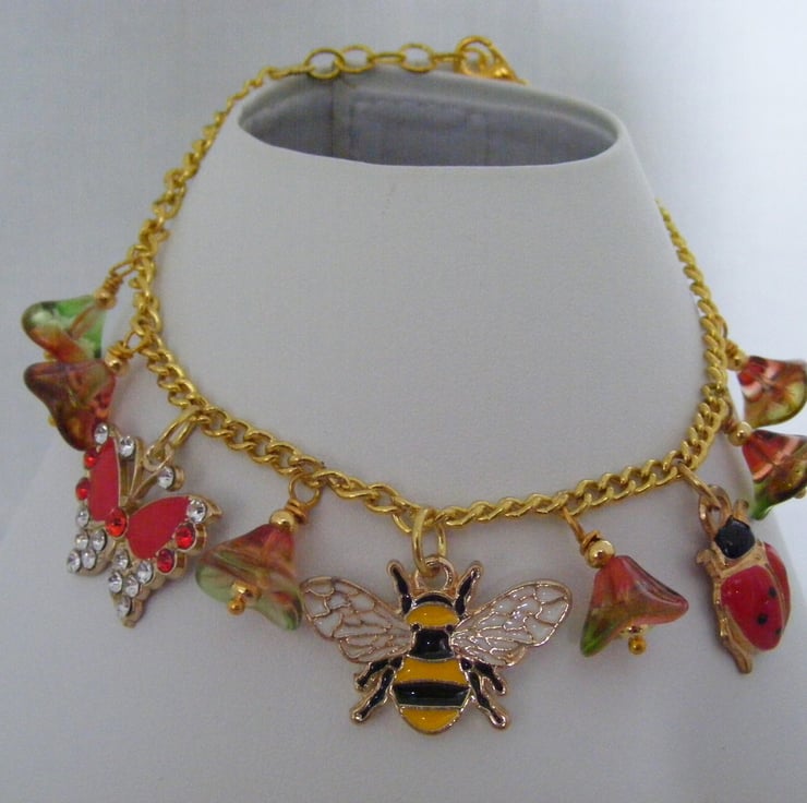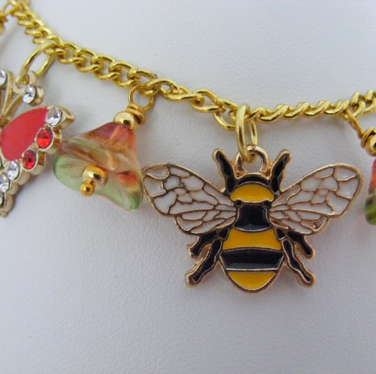 22 x 18 mm gold plated red enamel butterfly charms, 28 x 16 mm gold plated enamel bee charm, 22 x 15 mm gold plated enamel ladybird charm, gold plated headpins, chain, lobster clasp and extension chain.