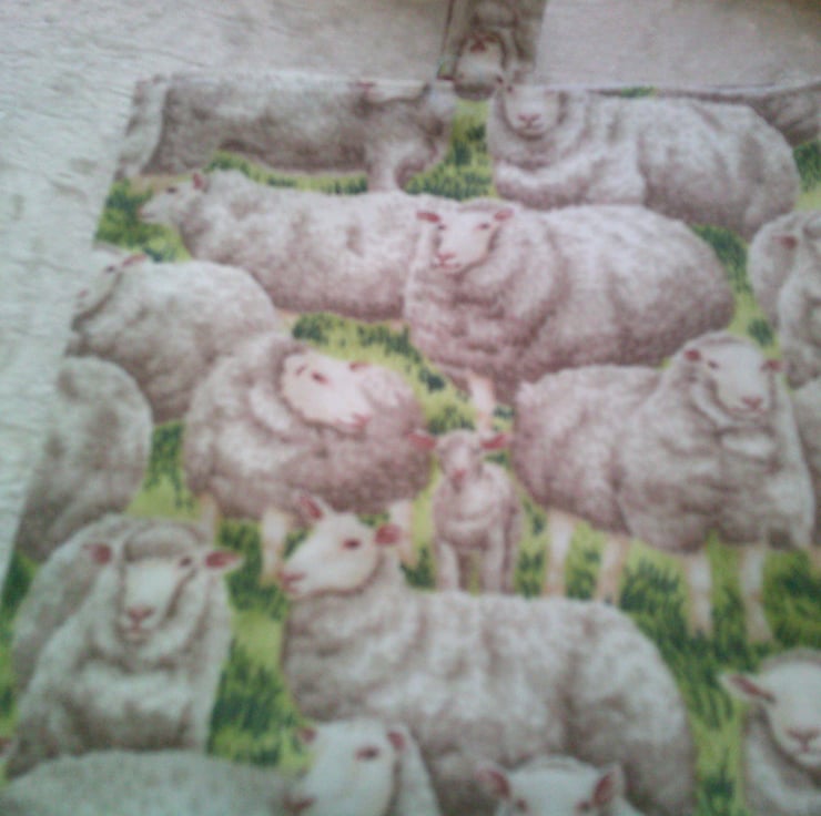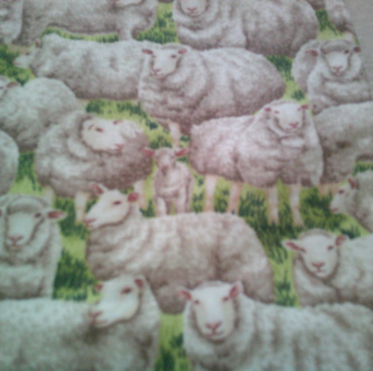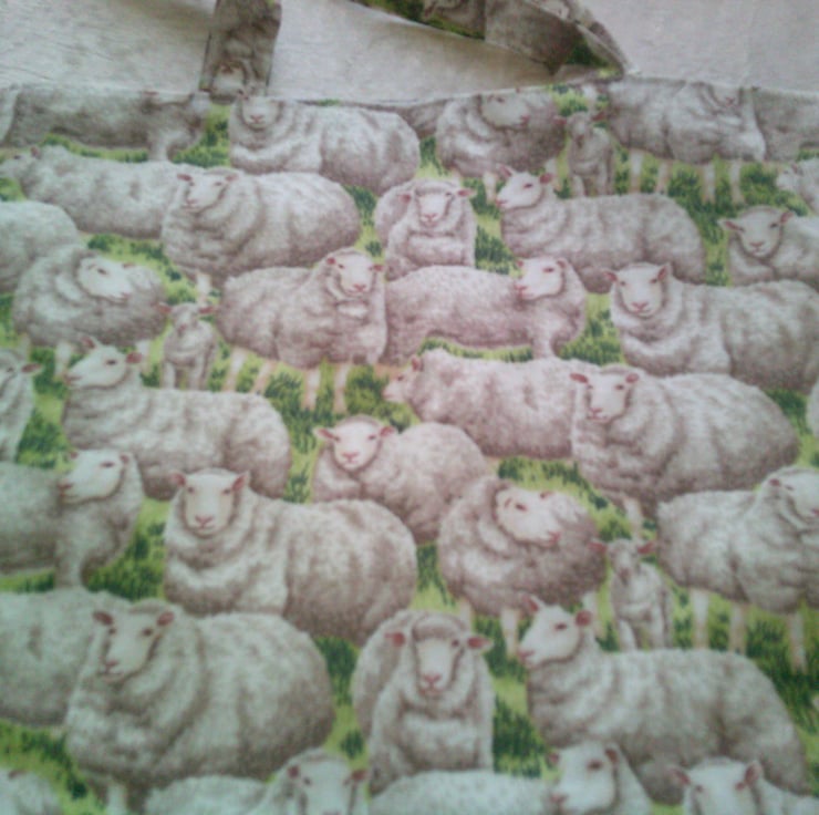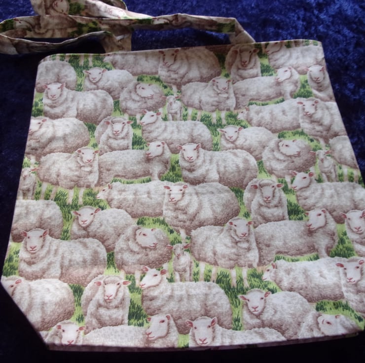 This handy size Eco-friendly fabric bag is made using 100% cotton fabric which has an overall design of a flock of sheep in a field.