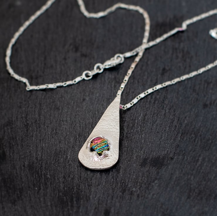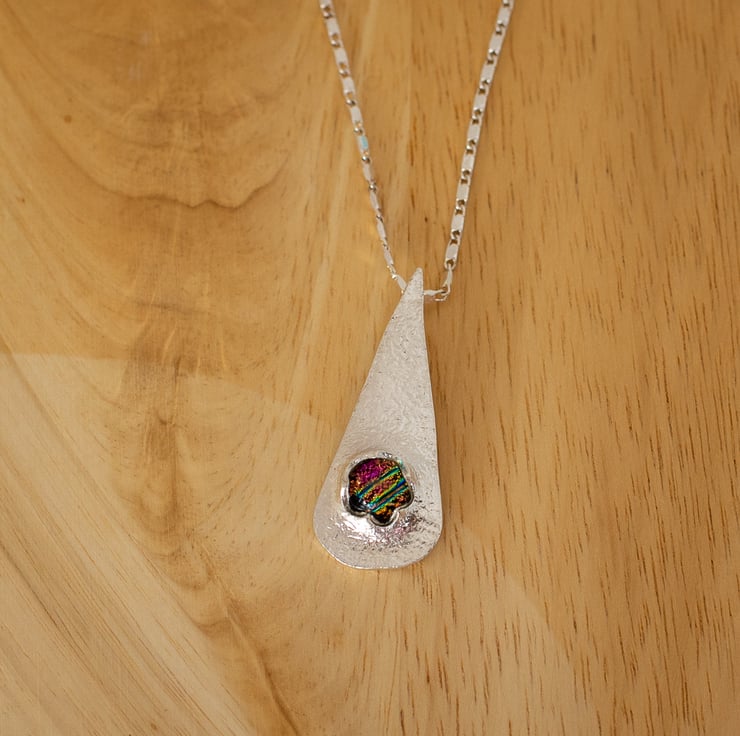 This is an elongated teardrop pendant with a dichroic stone set near the bottom of the pendant.