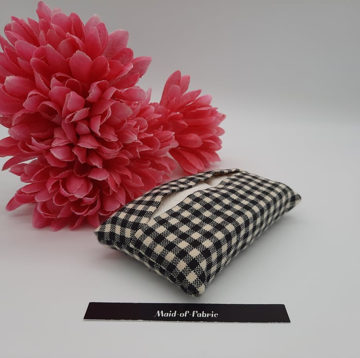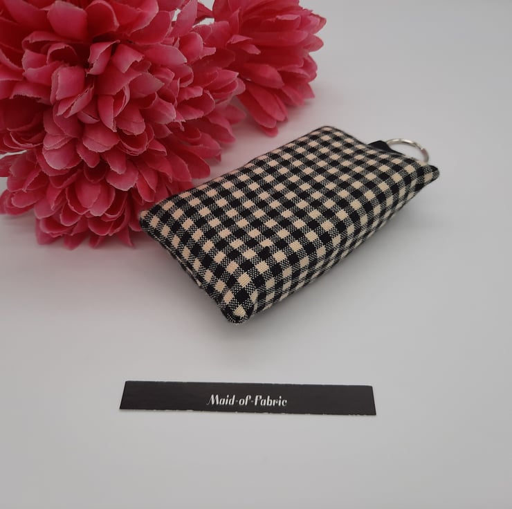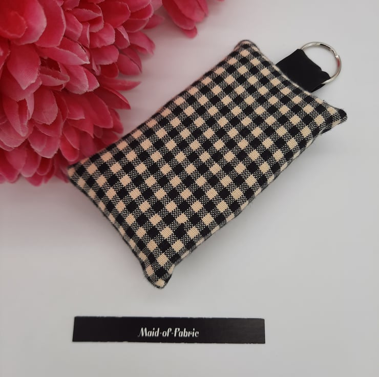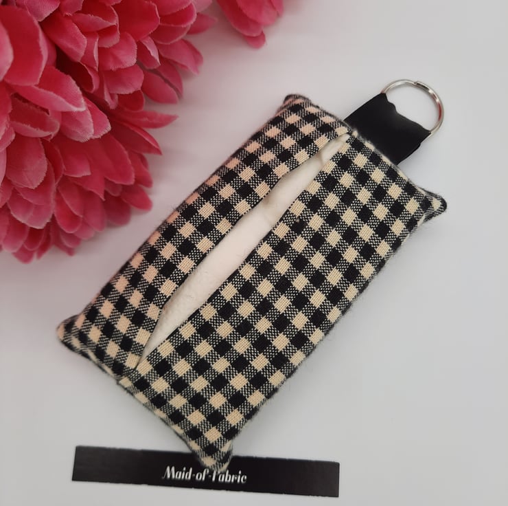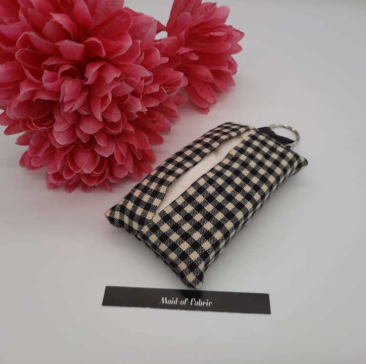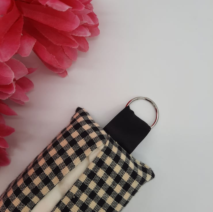 Keyring pocket tissue holder made using a black and cream cotton fabric and yellow lining.