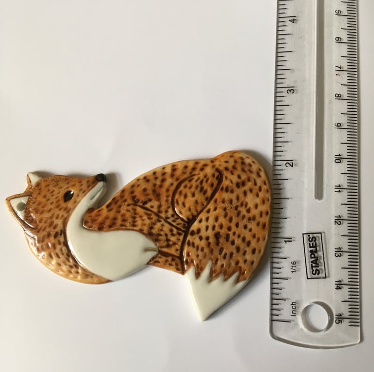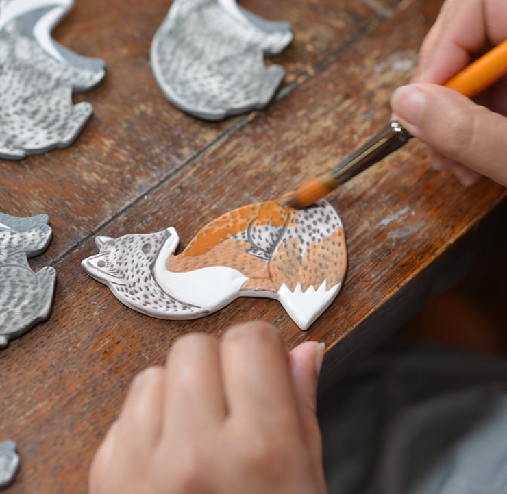 I use porcelain clay which I press into a mould That I designed and made using plaster.Once the fox has dried a bit I clean and tidy the edges and back by hand and make the hole for hanging.When they are fully dry they are fired in my kiln at 1096c. I then paint them using a colour layering technique, glaze them and fire them again to 1296c, making them glossy and heard wearing.