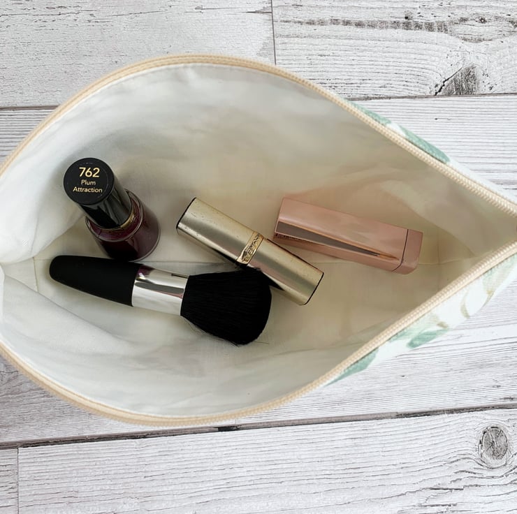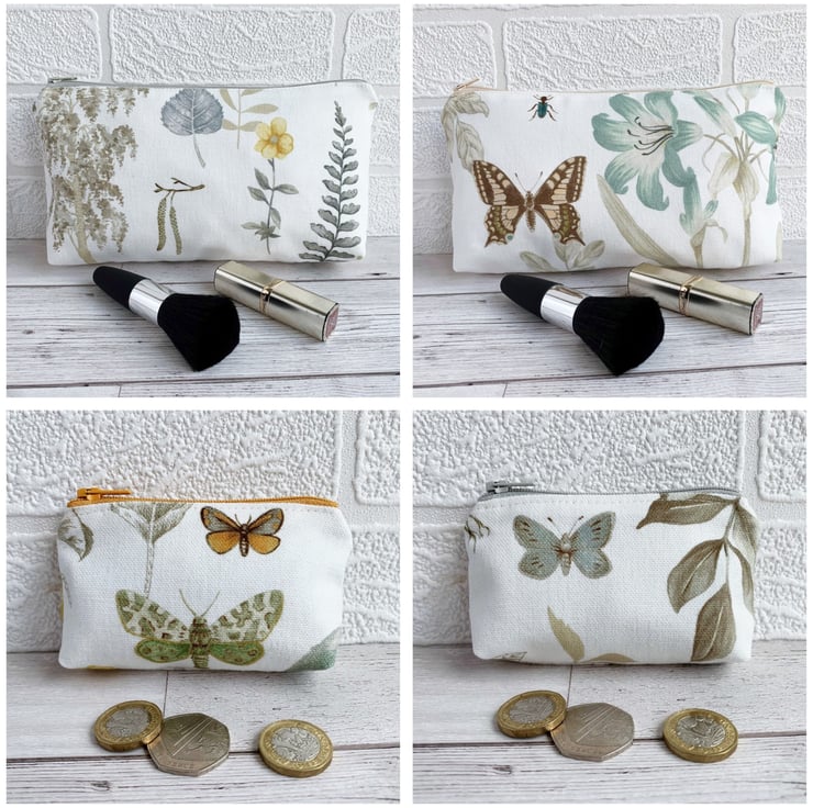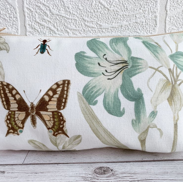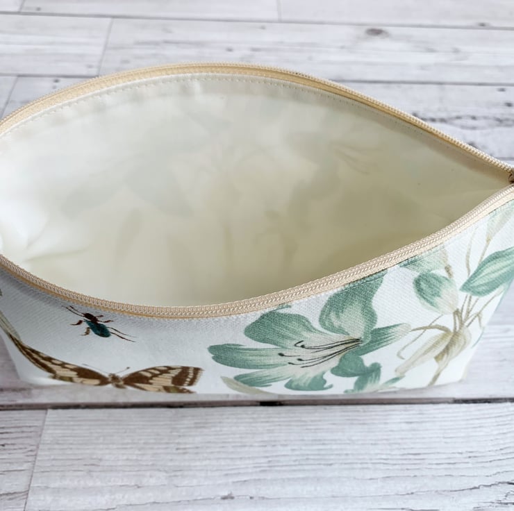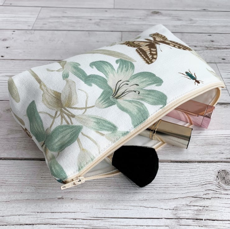 Botanical print make up bag with swallowtail butterfly. A lovely cosmetic bag made from botanical print fabric. The beautiful print pattern features pictures of British flora and fauna on a white background. A pretty swallowtail butterfly in shades of peach and brown is depicted alongside a spray of duck-egg blue lilies with pale sage green foliage. There are further sprays of pale sage green leaves and a blue insect. The make up bag fastens with a pale peachy-cream zip and is lined with cream fabric. The base of the bag is boxed giving extra space inside.
