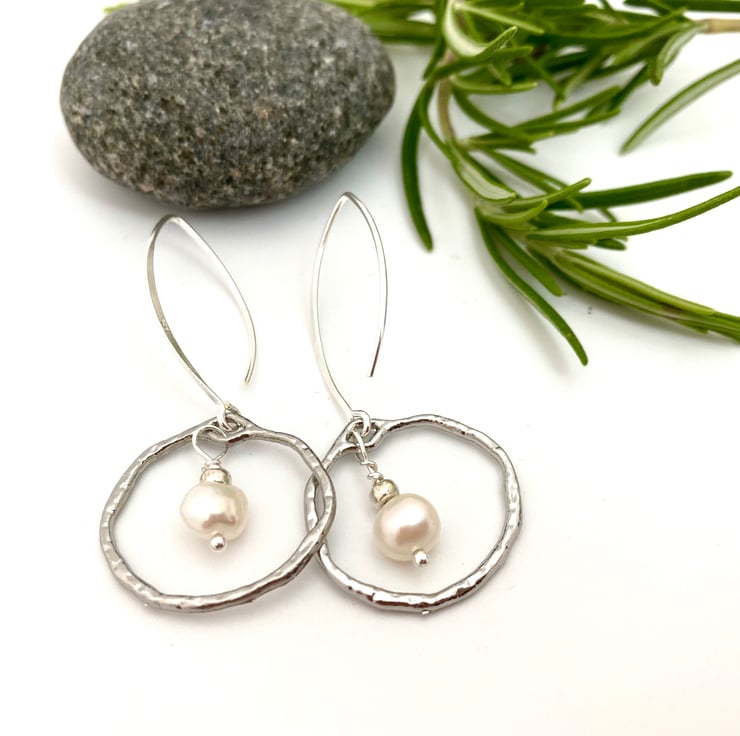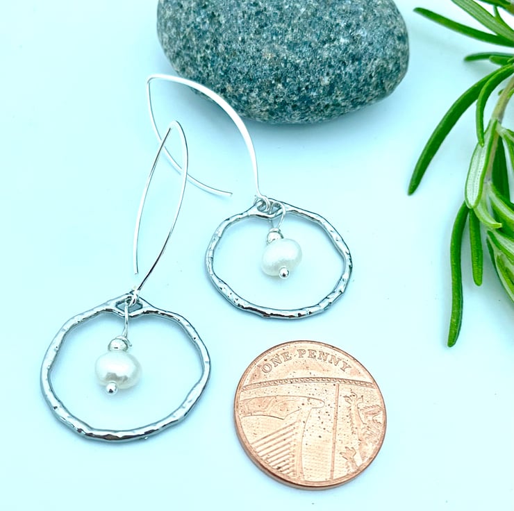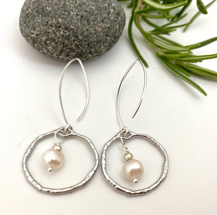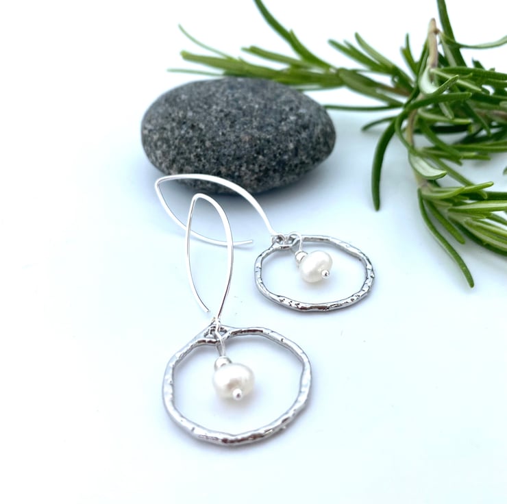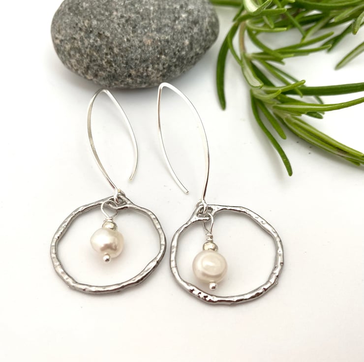 Silver, Pearl Drop Earrings. Long Hoop Earrings