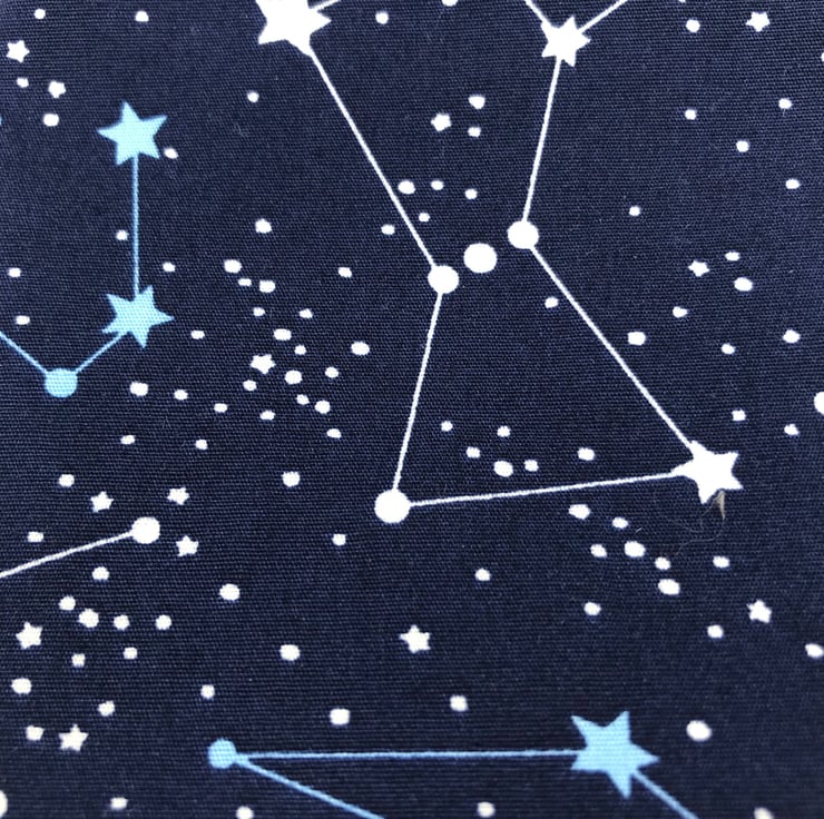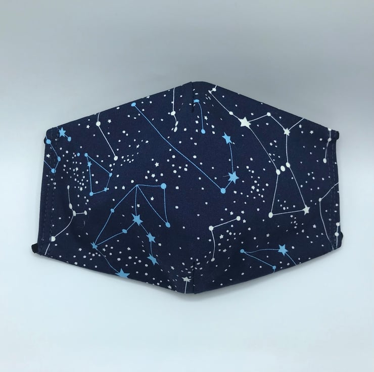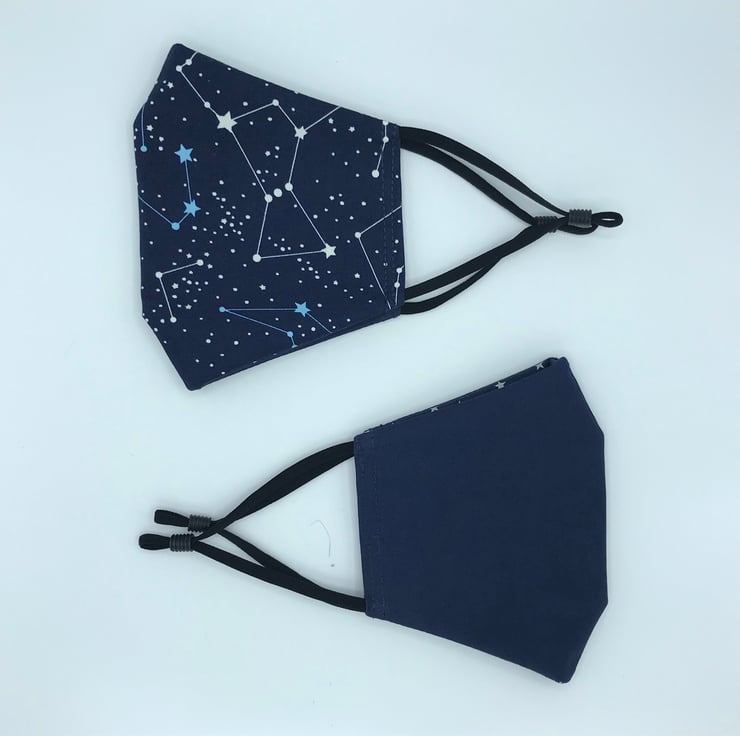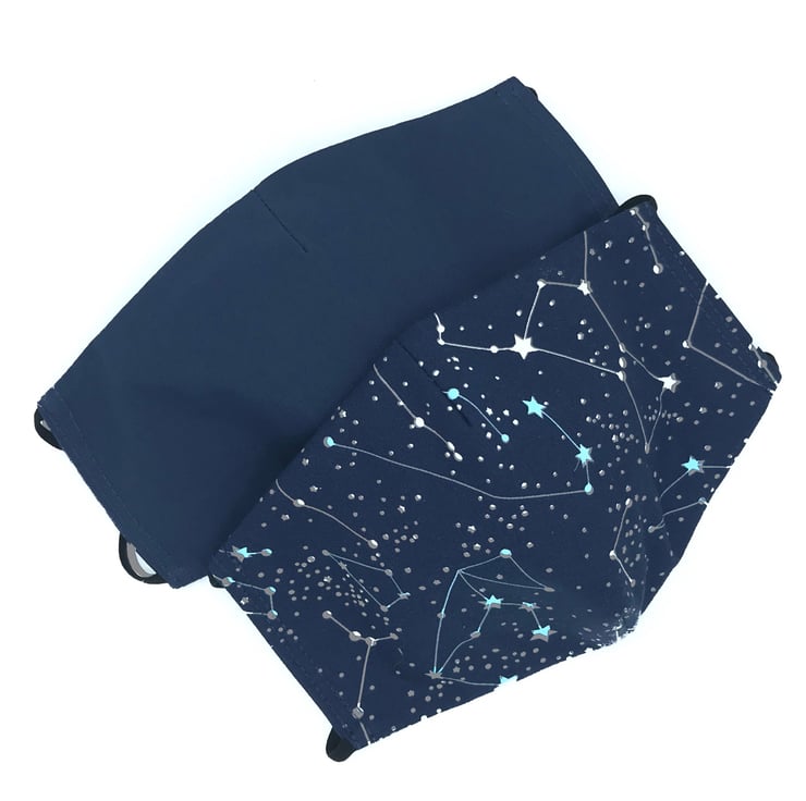 These masks are double-sided with an option for wearing as a patterned navy with star maps mask or plain navy blue.