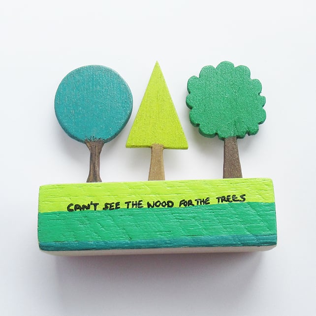 These majestic little trees are mounted on a wooden rectangle stand with the text ‘CAN’T SEE THE WOOD FOR THE TREES’ written over a green painted design on the front side. Double sided if you prefer the reverse side.