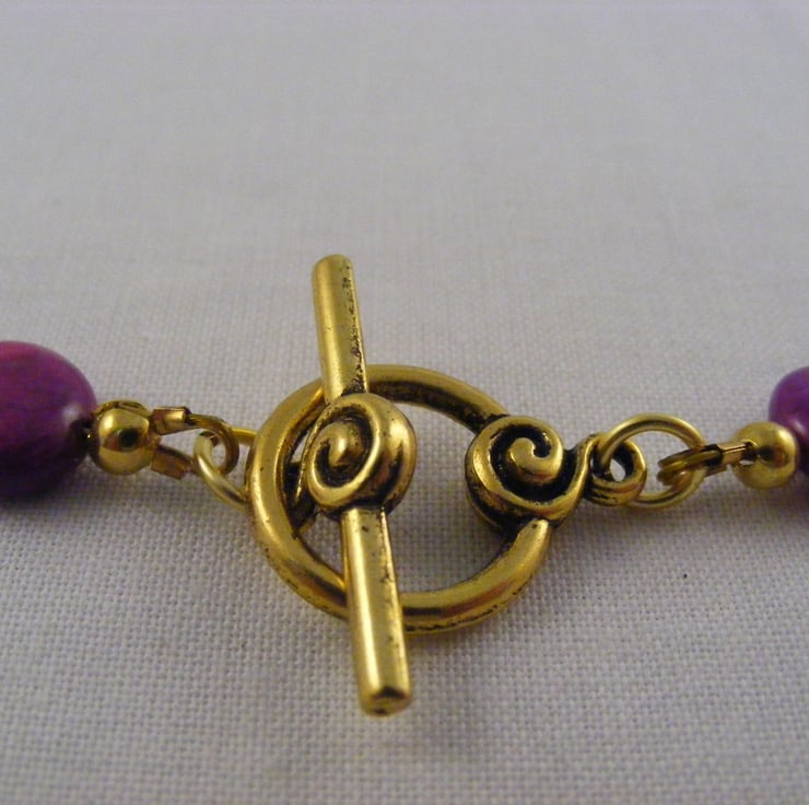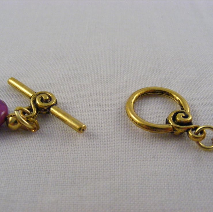 10 mm purple howlite coins which are threaded on to beading wire. Ends are finished with gold plated findings. Clasp is a gold plated toggle.