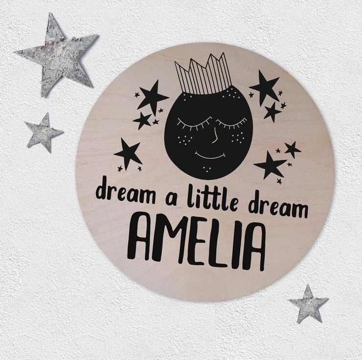 This personalised wooden wall sign is handmade to order and available in two colour choices. The simple, contemporary style adds a charming Scandi feel. Made from natural birch wood, the wooden sign features the beautiful natural grain - no two pieces are the same. Personalised and featuring the wording 'Dream a little dream', this will be a lovely addition to any room.
