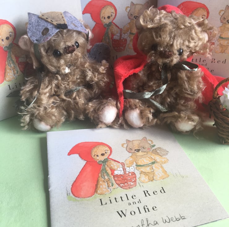 Little Red and Wolfie are a pair of miniature teddies that I created to celebrate 10 years of Moby and Puddle.