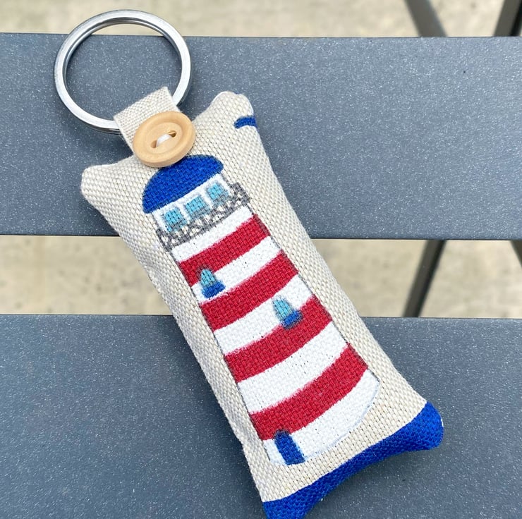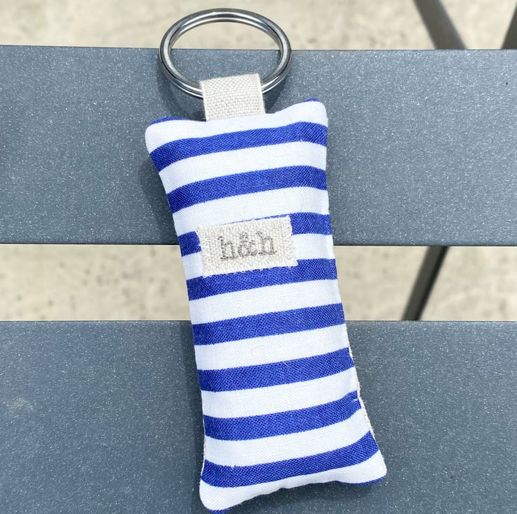A red and white striped lighthouse on taupe linen-look cotton, backed with navy blue and white nautical stripes, topped off with a wooden button and a silver-coloured split-ring securely attached with a linen tape loop. Filled with fragrant lavender. Plus a little linen 'h&h' label on the back.