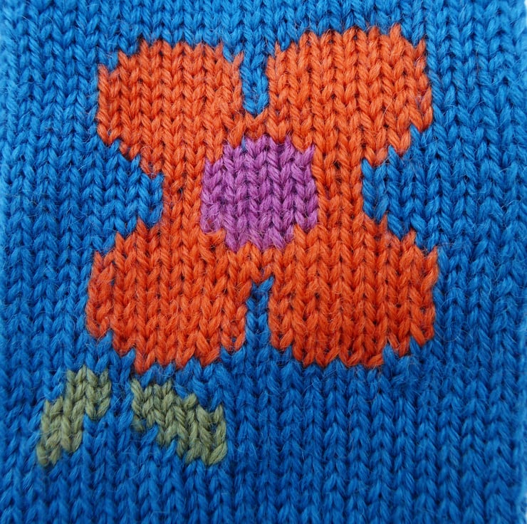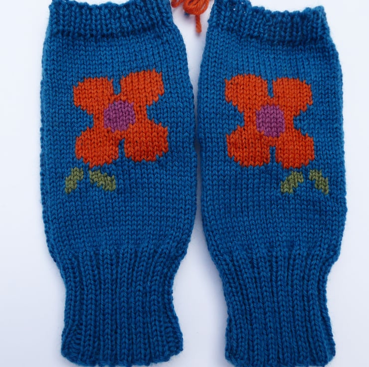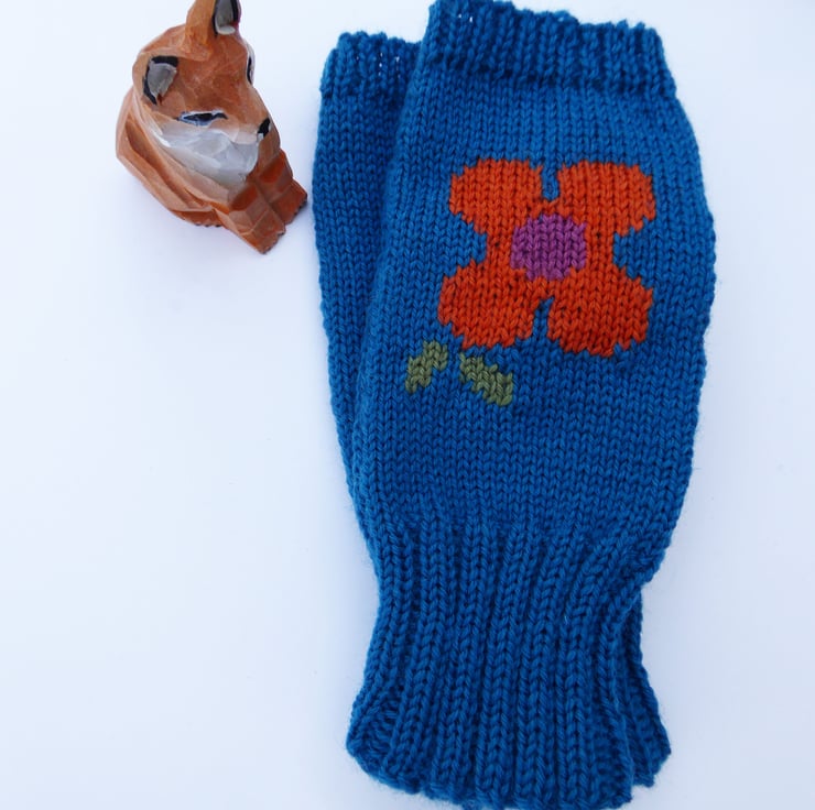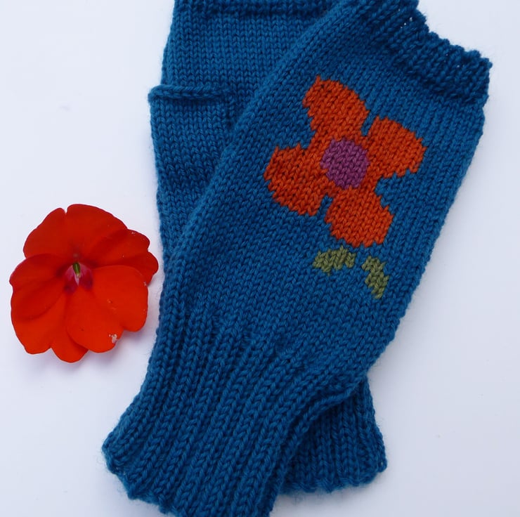 Knitted wool fingerless gloves with a bright flower design. I have made these fun warm gloves on my vintage knitting machine using merino blend 4ply wool. I have used the intarsia knit method which means there are no floats on the inside of the gloves to snags fingers, making them comfy to wear. Great to wear when you want to keep your hands warm, but fingers free for tasks, such as drawing, painting, gardening.