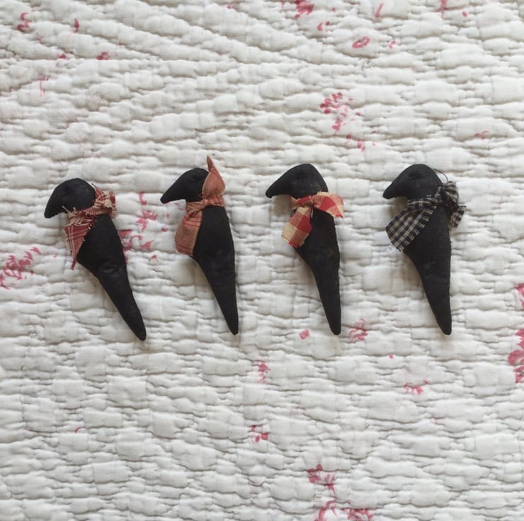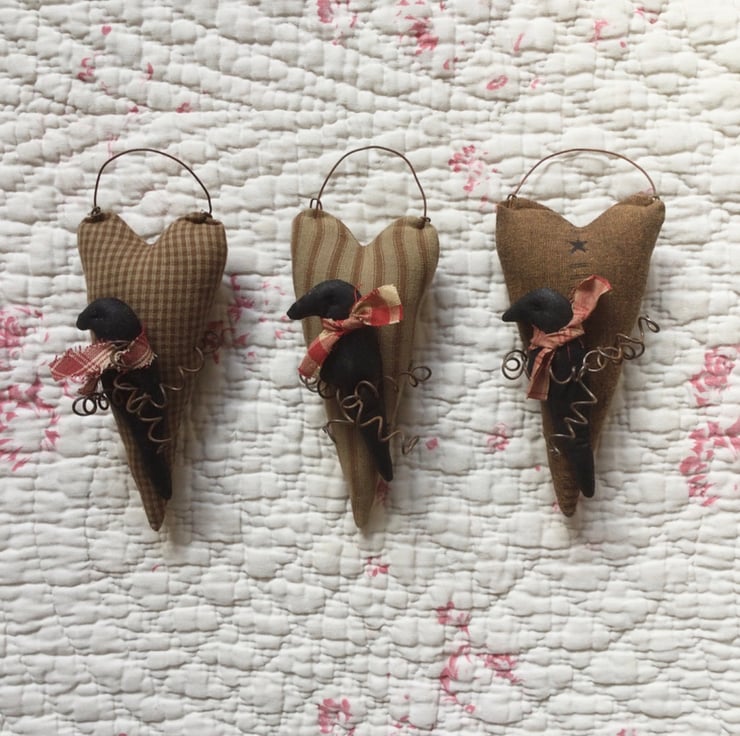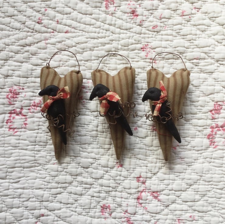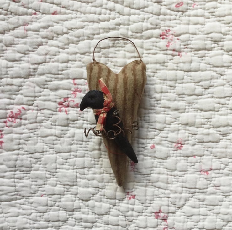 Trimmed with a rusty coiled wire, holding in place a black crow trimmed with a homespun fabric tie.