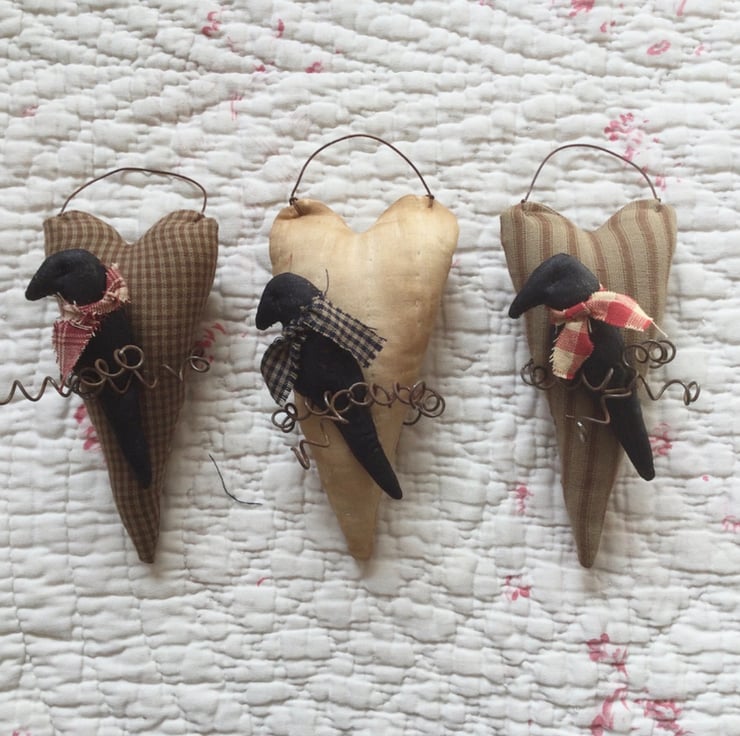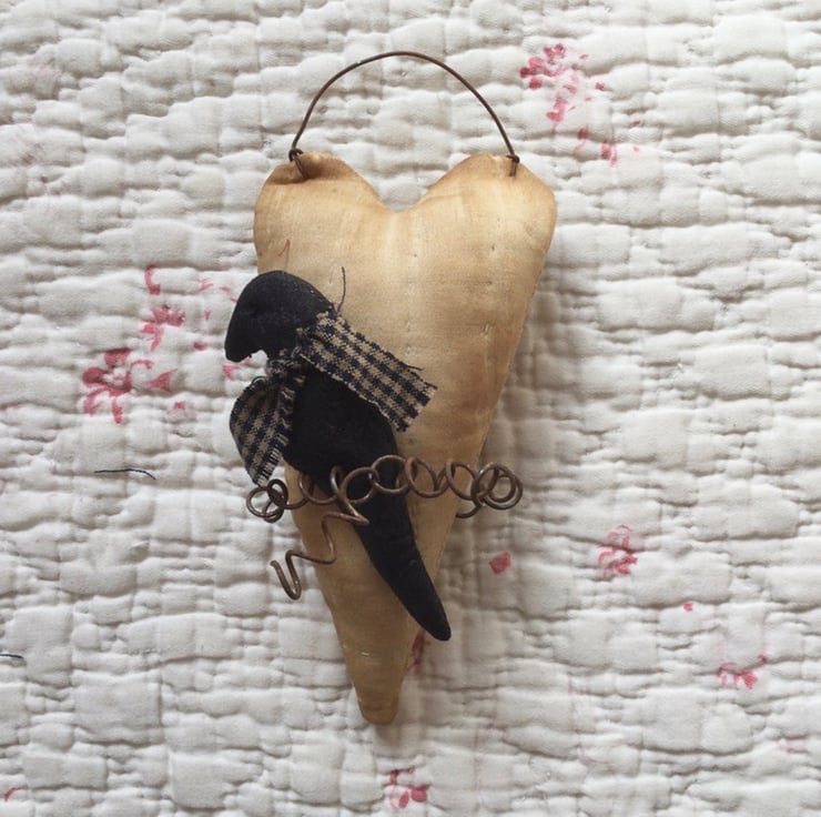 Trimmed with a rusty coiled wire, holding in place a black crow trimmed with a homespun fabric tie.