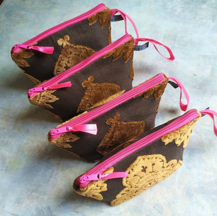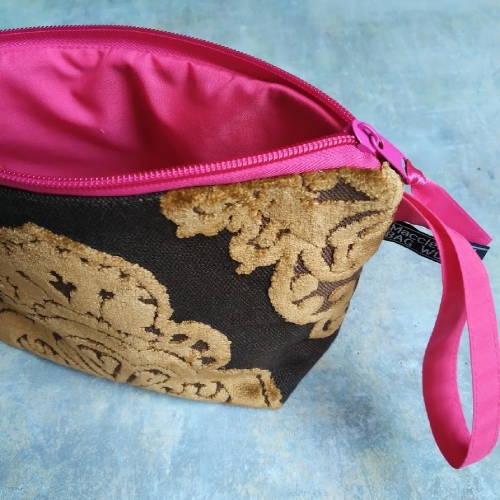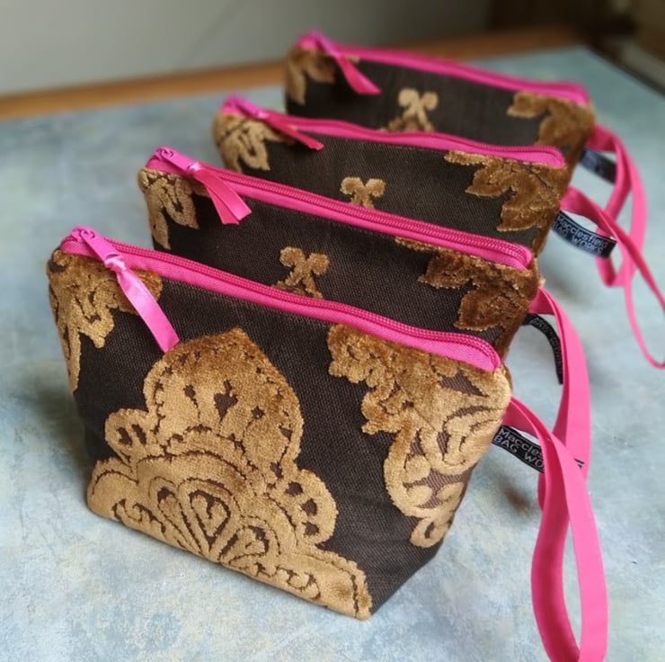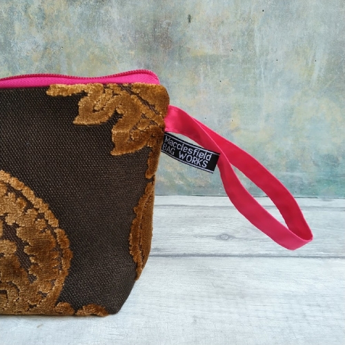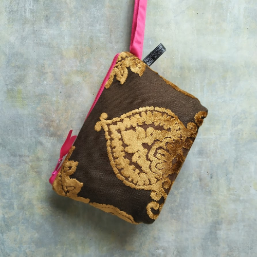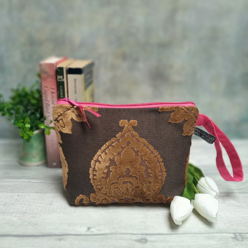 Made from bronze and brown damask upholstery textile, this little pouch bag makes a perfect make up bag, pencil case, or a clutch bag for all those everyday essentials that we need to carry these days!!