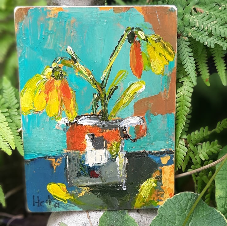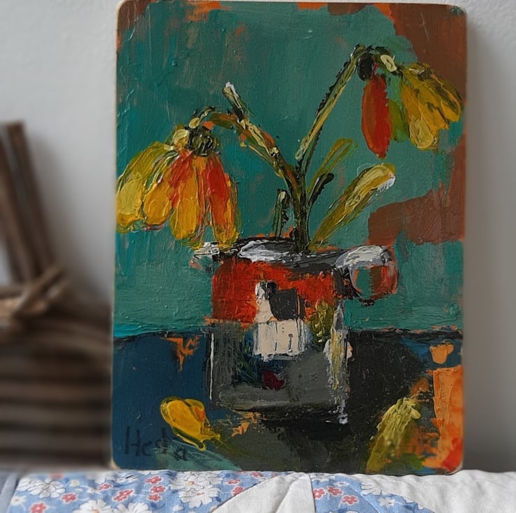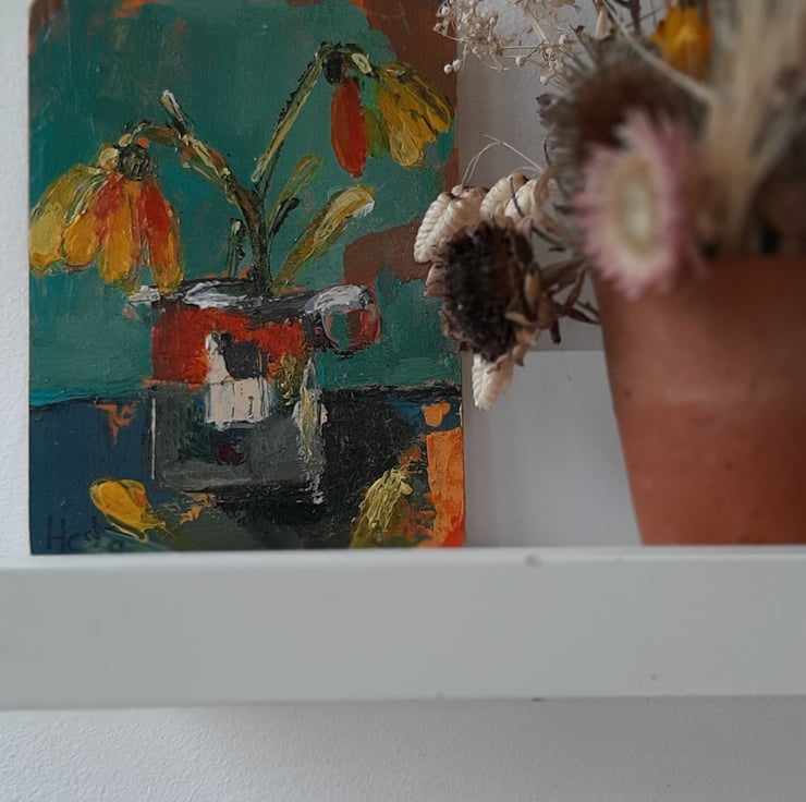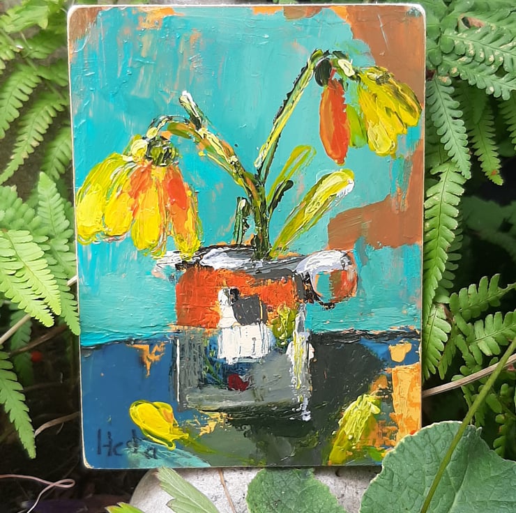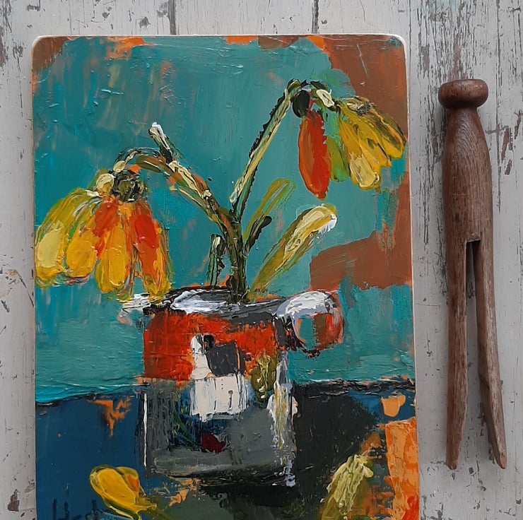 This contemporary still life has texture,depth and rich colours. The yellow pops against the blue .A confident little original measuring 16 cm.tall and 12 cm wide. By hesta singlewood aka bodkincreates on Instagram