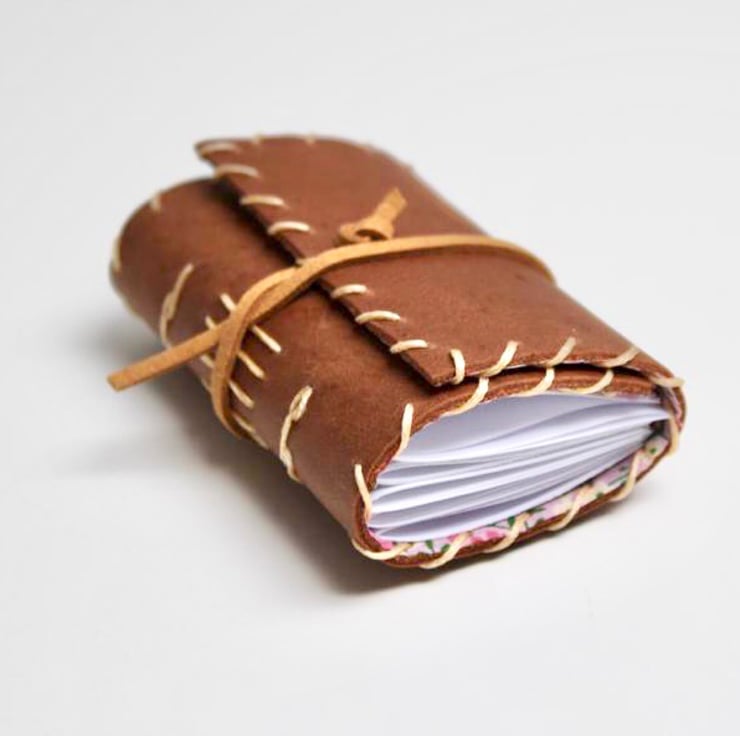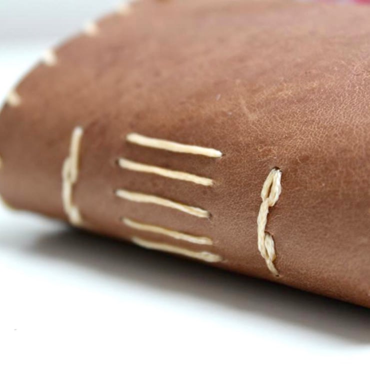 A lovely brown coloured leather with a pretty pink and cream floral fabric lining. The notebook is hand stitched around the edge with a cream coloured thread and contains 120 sheets of plain paper which are then hand stitched to the leather in 5 signatures. The notebook is fastened with a light coloured suede cord tied loosely at the front.